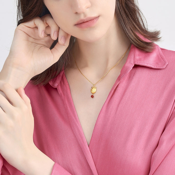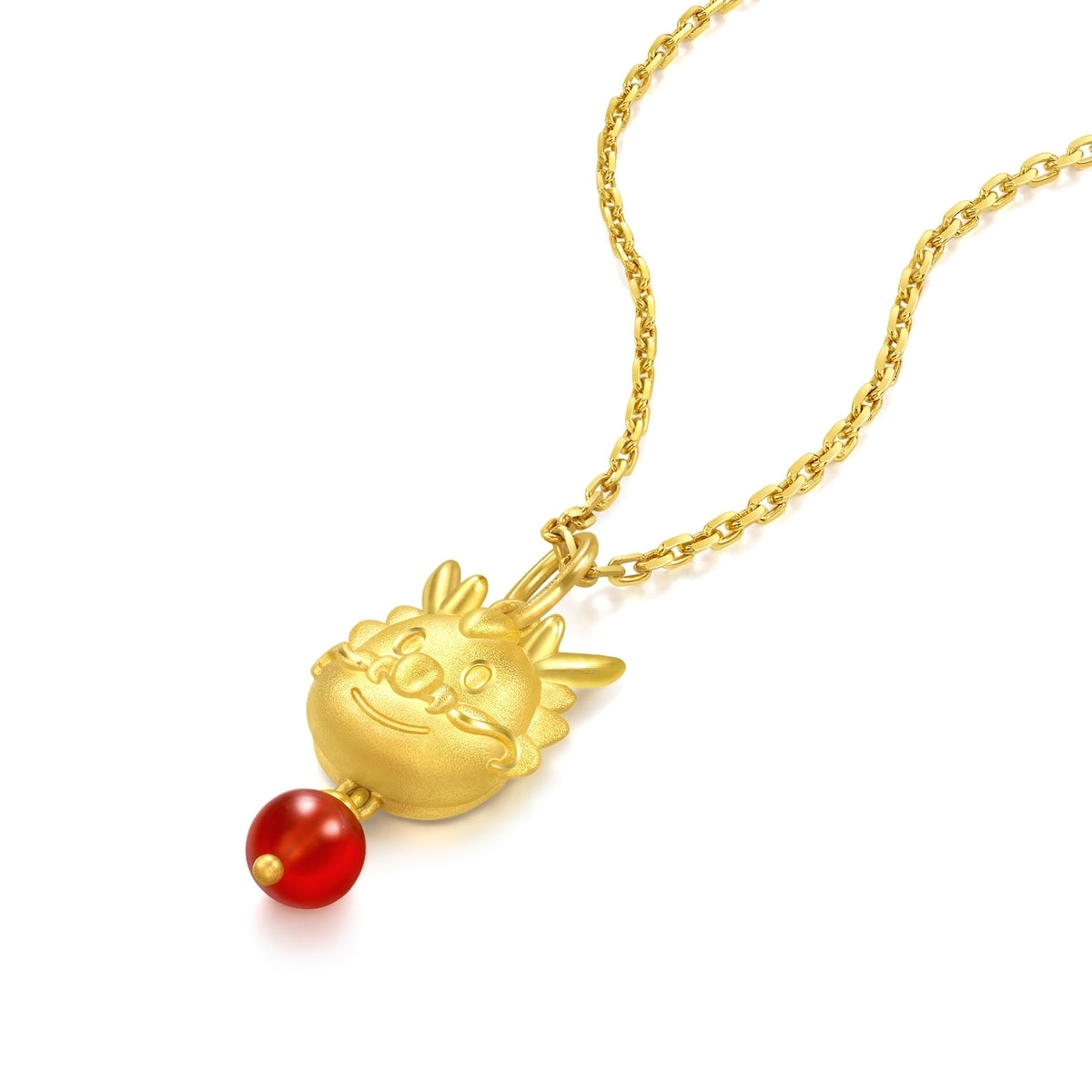 This New Year & Chinese Zodiac 999.9 Gold Pendant by Chow Sang Sang showcases a three-dimensional baby dragon design, crafted using mold casting. The addition of natural red agate beads enhances its elegance, symbolizing wealth and luck, making it a meaningful piece for special occasions.