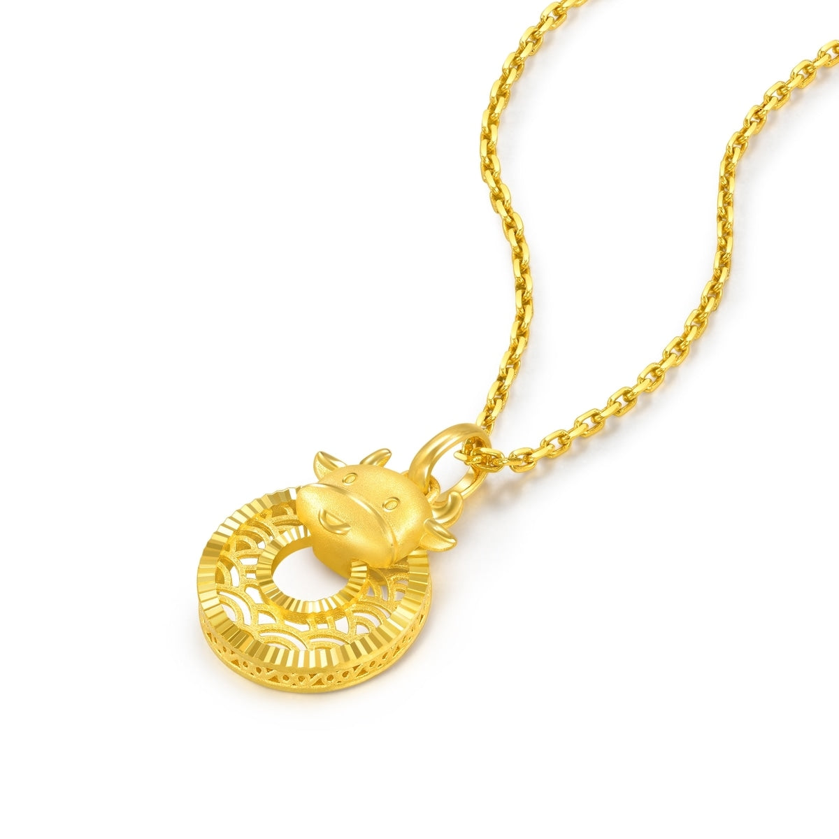 This New Year & Chinese Zodiac 999 Gold Pendant by Chow Sang Sang showcases a three-dimensional ox shape adorned with intricate floral and water wave patterns. Created using the 5G gold technique, this pendant brings good luck, brightness, wisdom, and eternity to the wearer.