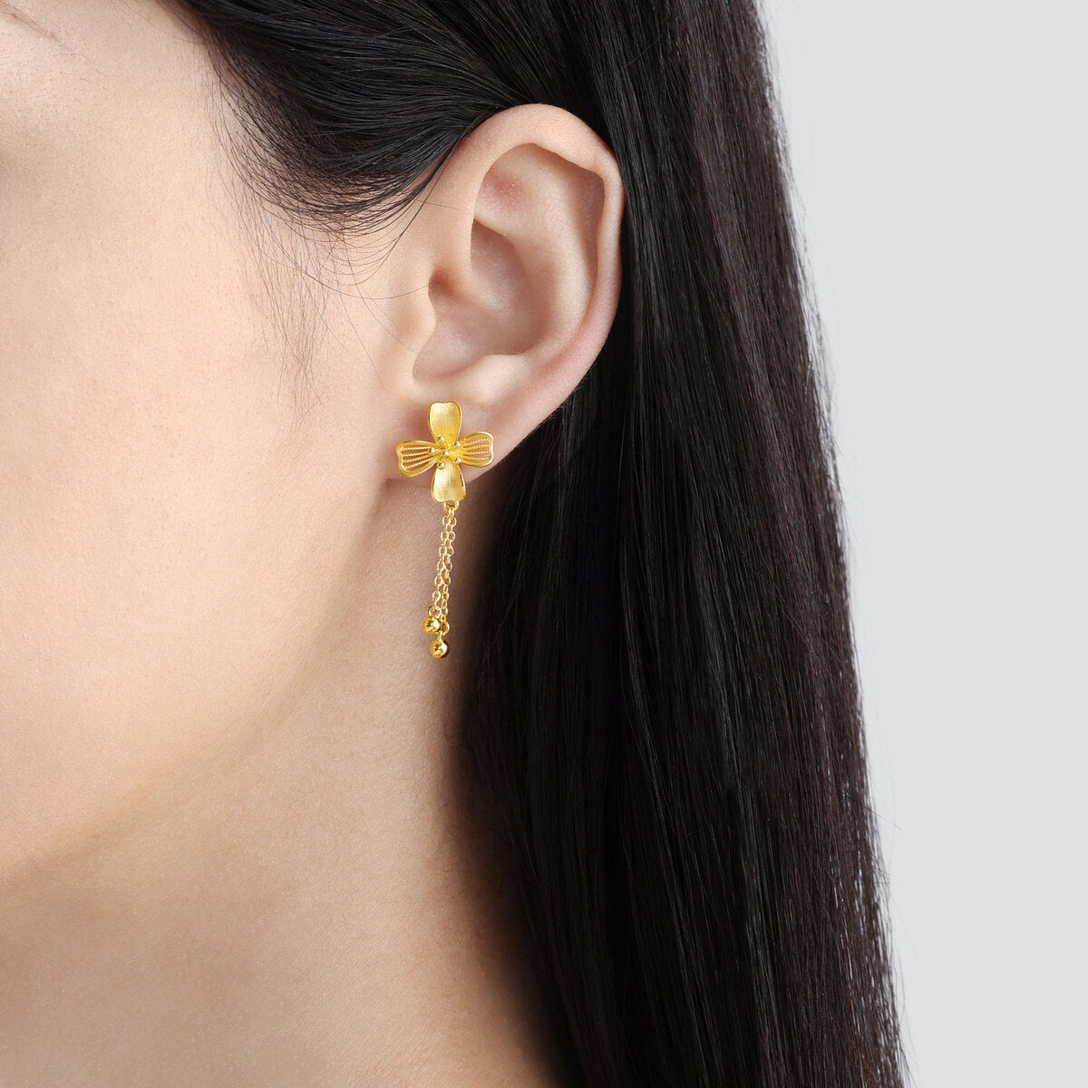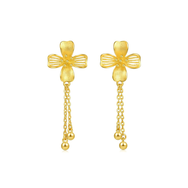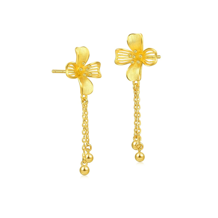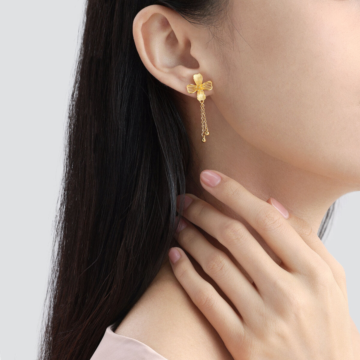 These Floral 999.9 Gold Earrings by Chow Sang Sang are inspired by the Osmanthus fragrans flower. With a brushed finish and hollow design, these earrings feature elegant tassels that sway, symbolizing wealth and happiness.