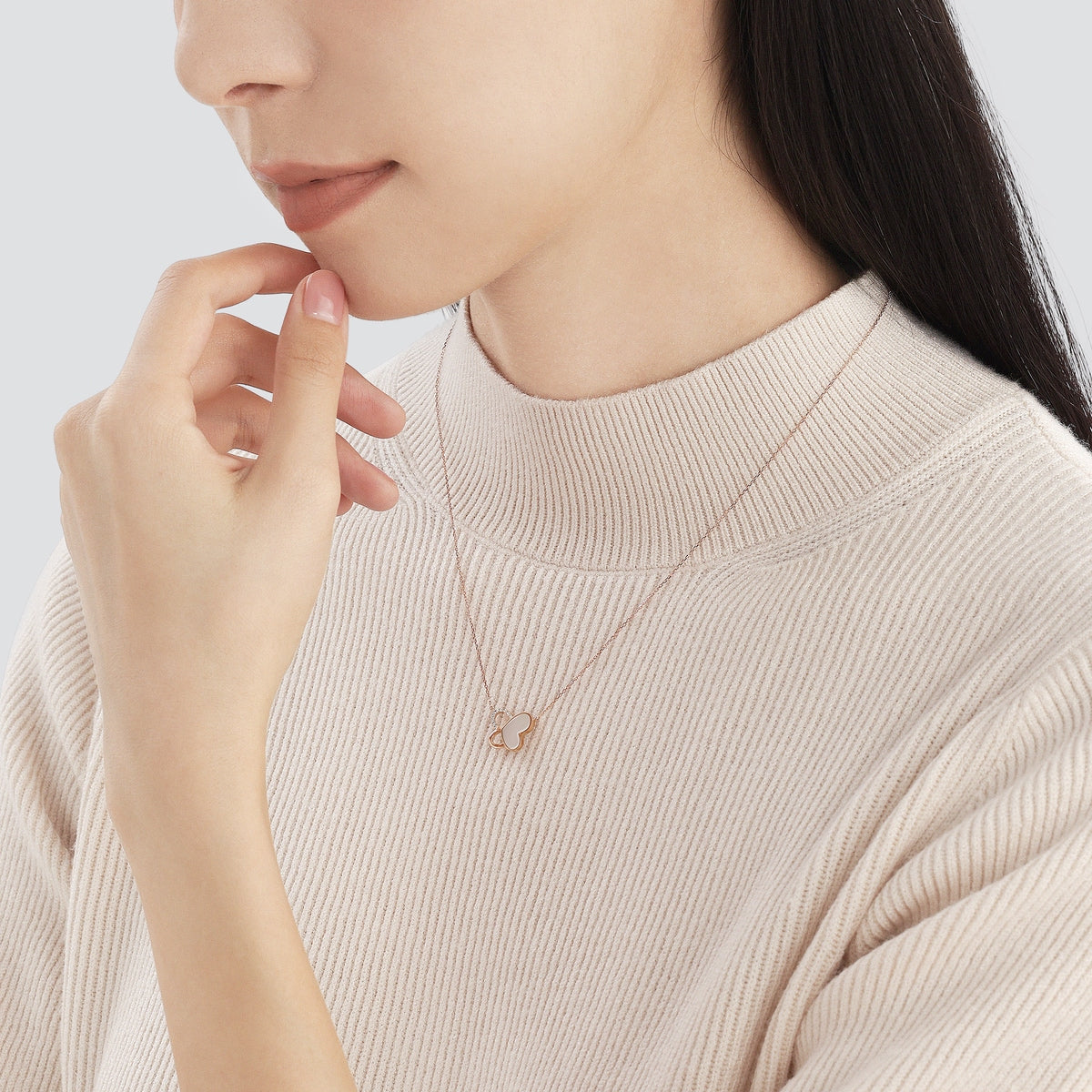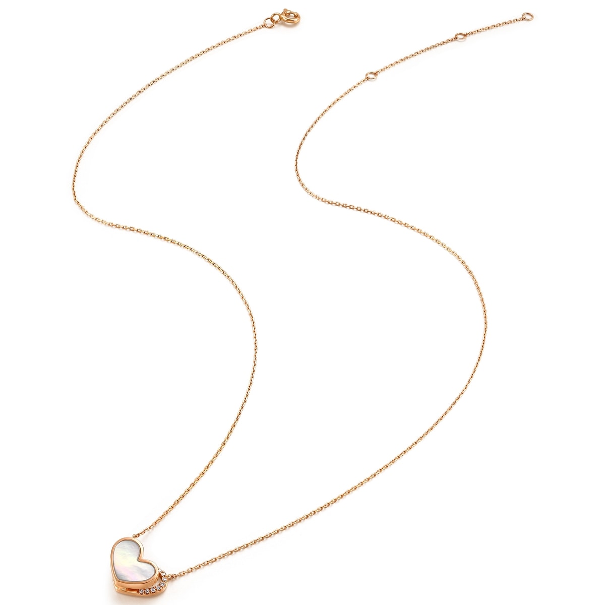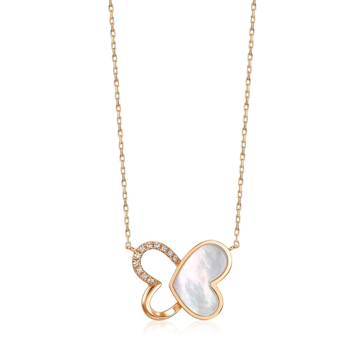 This 18K Rose Gold Diamond Necklace by Chow Sang Sang is a romantic design that can switch between the shapes of 'love' and 'butterfly,' symbolizing love and happiness. The diamonds and mother of pearl create a beautiful contrast, with the butterfly dancing romantically.