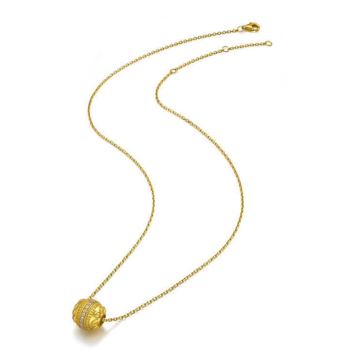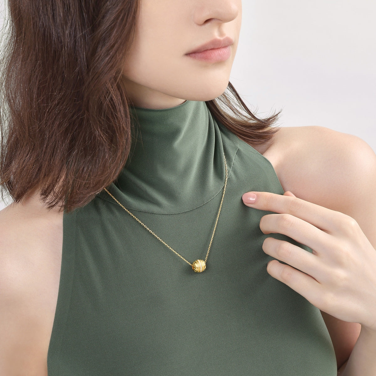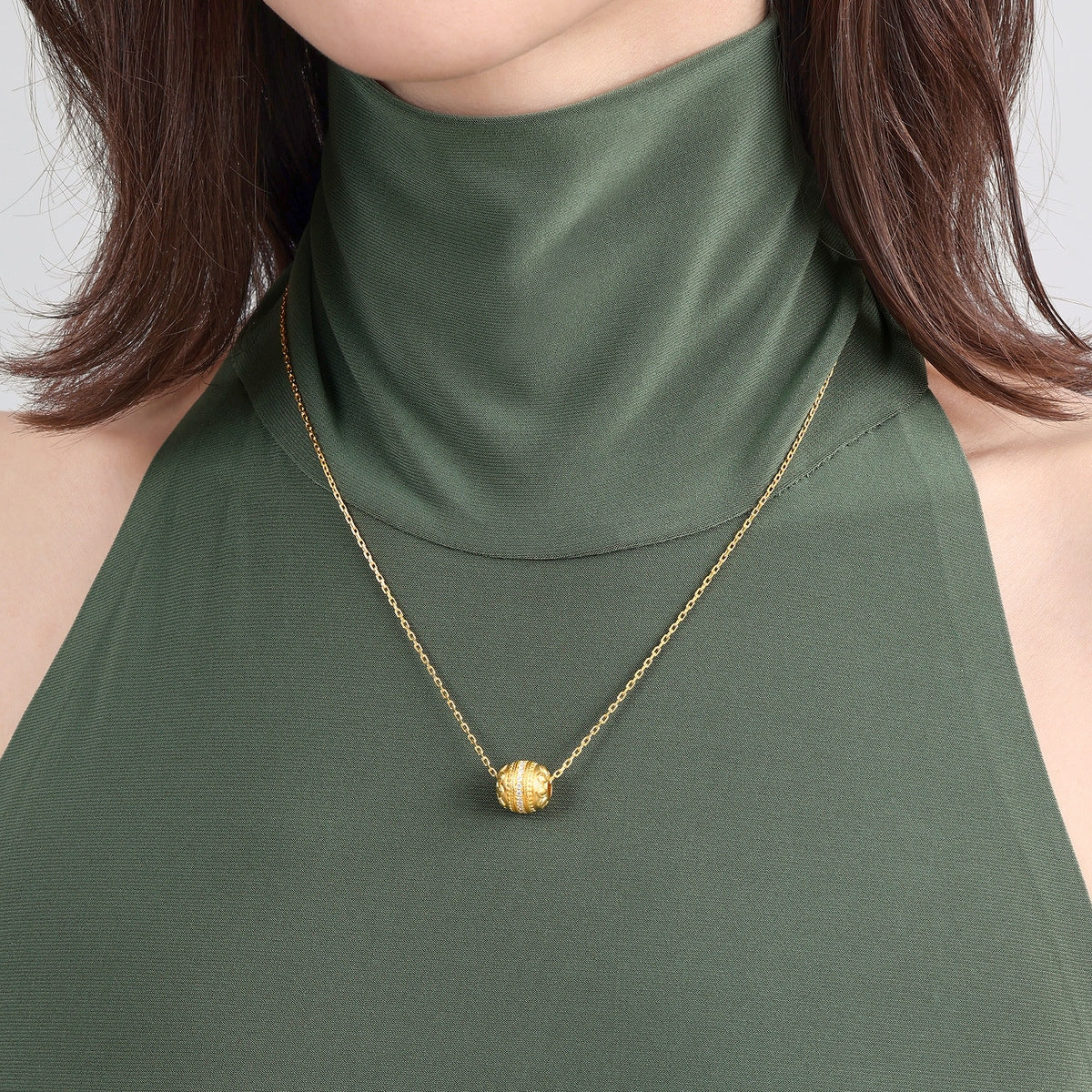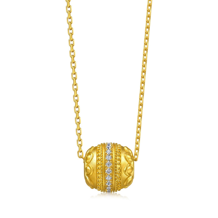 This 'Daily Bliss' 999.9 Gold Necklace by Chow Sang Sang is crafted with ancient gold techniques, merging a lotus and fortune bead design. The necklace’s central axis sparkles with diamonds, while the sides of the fortune bead display intricate lotus engravings, symbolizing purity and happiness. This piece brings elegance and cultural symbolism to any jewelry collection.