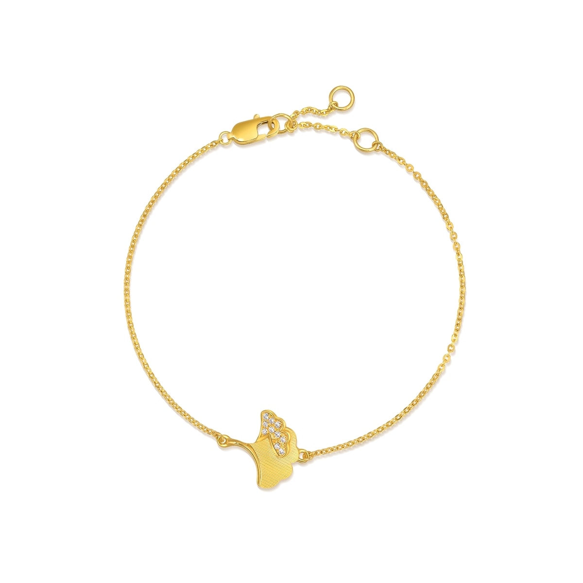 This 999 Gold Bracelet by Chow Sang Sang takes inspiration from the graceful 'Ginkgo leaf.' Crafted using a hard solid gold technique and set with meticulously arranged diamonds, it brings an elegant and fashionable flair to daily wear.