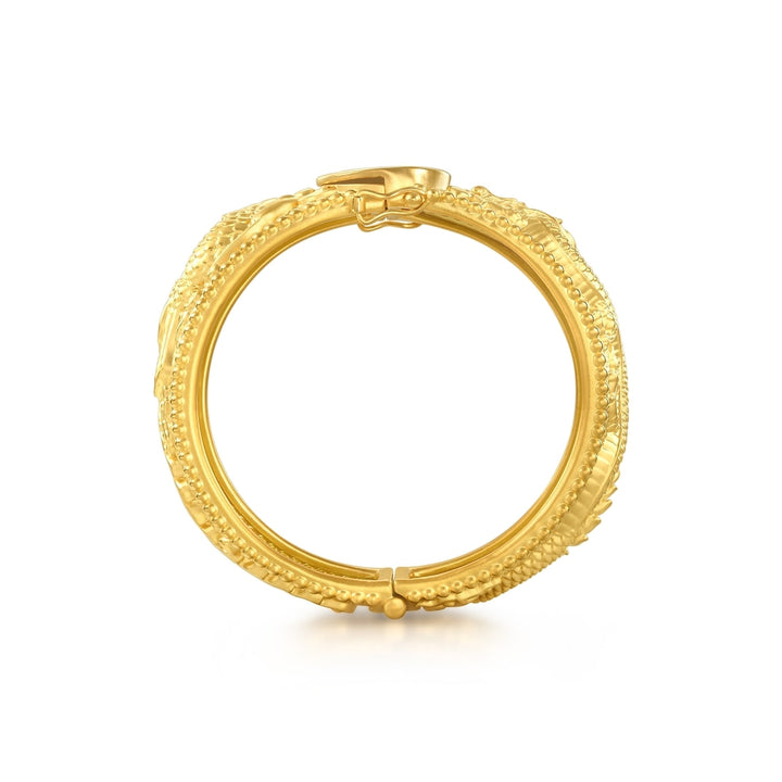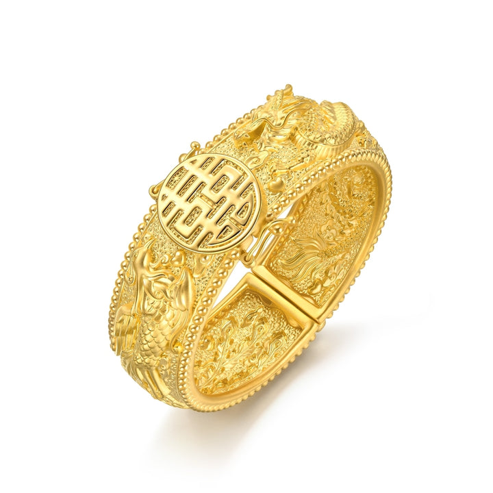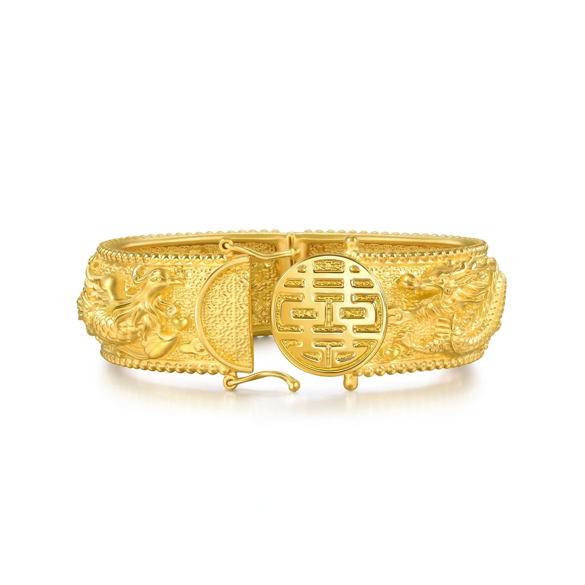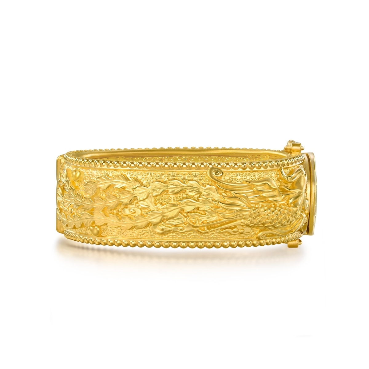 This 'Dragon & Phoenix' 999.9 Gold Bangle by Chow Sang Sang embodies rich cultural symbolism, crafted to represent prosperity and unity. Its intricate design makes it an elegant statement piece, perfect for those who appreciate heritage-inspired jewelry.