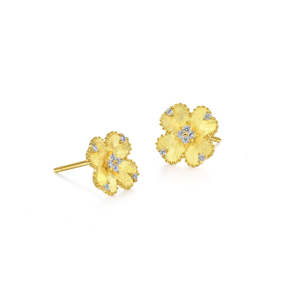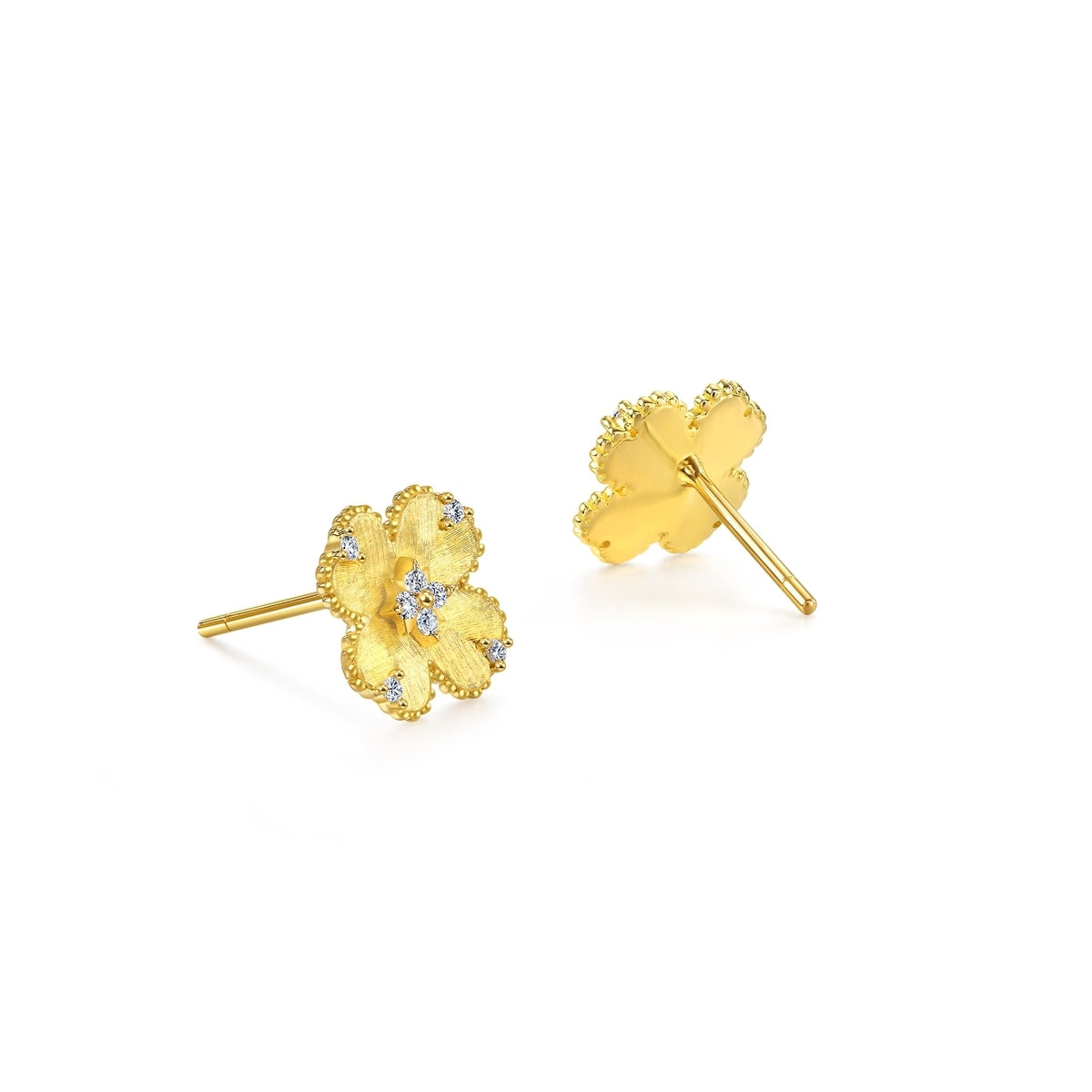 These Blossom 999 Gold Earrings by Chow Sang Sang feature a four-leaf clover design with a delicate brushed finish, adding a vintage charm. Adorned with sparkling diamonds, these earrings symbolize good luck and exude elegance and nobility.
