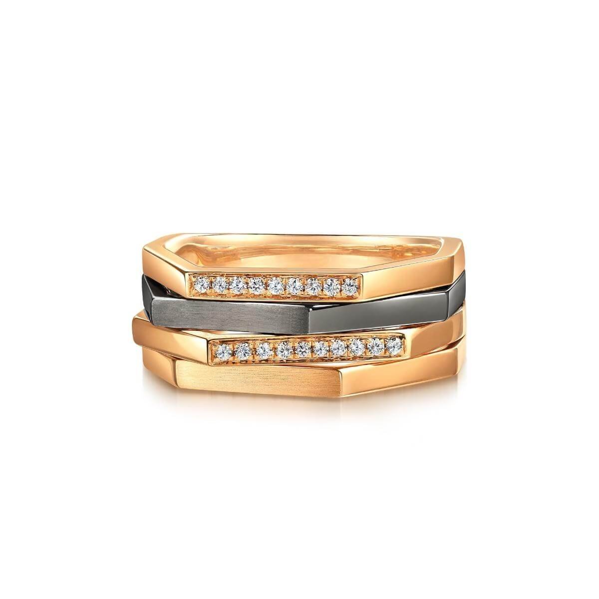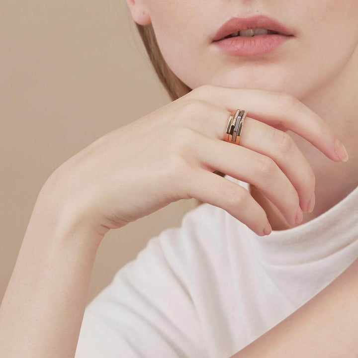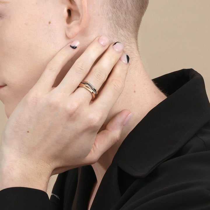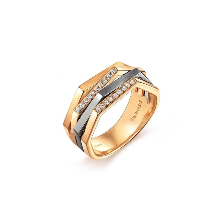 Based in Hong Kong, Emphasis shares a fresh take on fine jewelry with a focus on everyday elegance. Combining innovative designs, precious materials and superior craftsmanship, Emphasis creates pieces expressing multifaceted beauty. Believing well-designed jewelry is all about unique details, every piece by Emphasis will draw you in for a closer look. Emphasis also collaborates with talented designers to create jewelry collections that will surprise and delight.Style notes: Deconstructing and reconstructing the brand logo “M', the neat design is blended with angling geometric flair. This 18K rose and black gold quadruple ring is bound irregularly; adorned with ravishing diamonds, it crowns women's multi-faceted versatility with immeasurable honour.Price: Please note price may vary due to exchange rate differences or shipping, duties and taxes. Price may also vary with materials choice. Final price is calculated at checkout at the designer's website. Materials: 18k gold with round brilliant diamonds, total carat weight 0.09 ct.