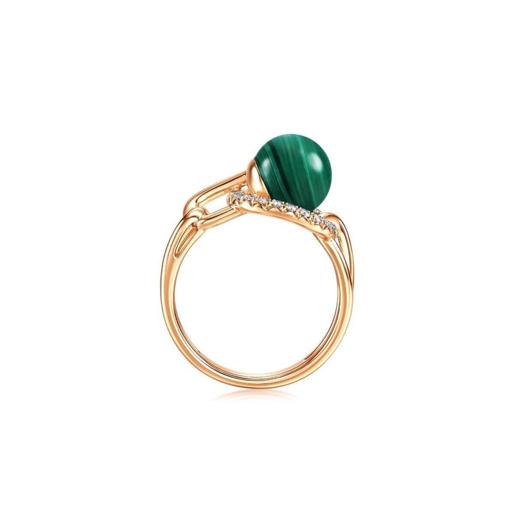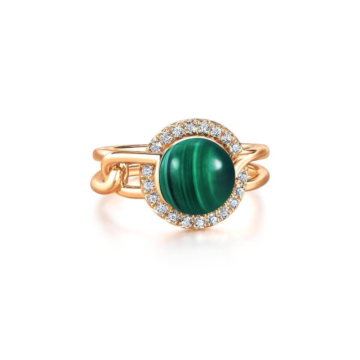 18k gold with round brilliant diamonds, total carat weight 0.14 ct and malachite.
