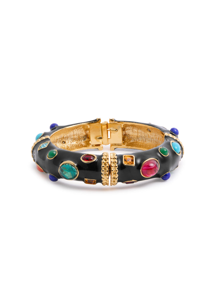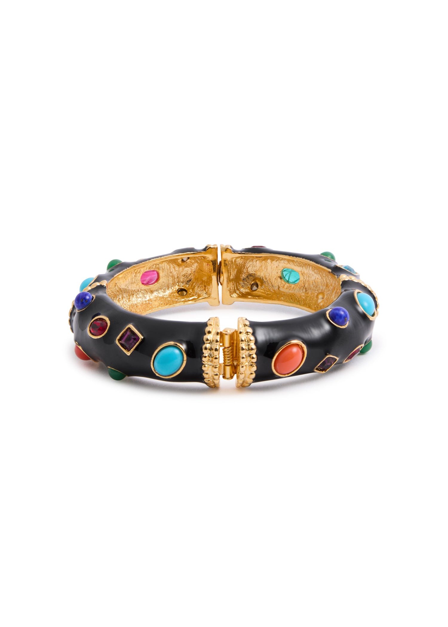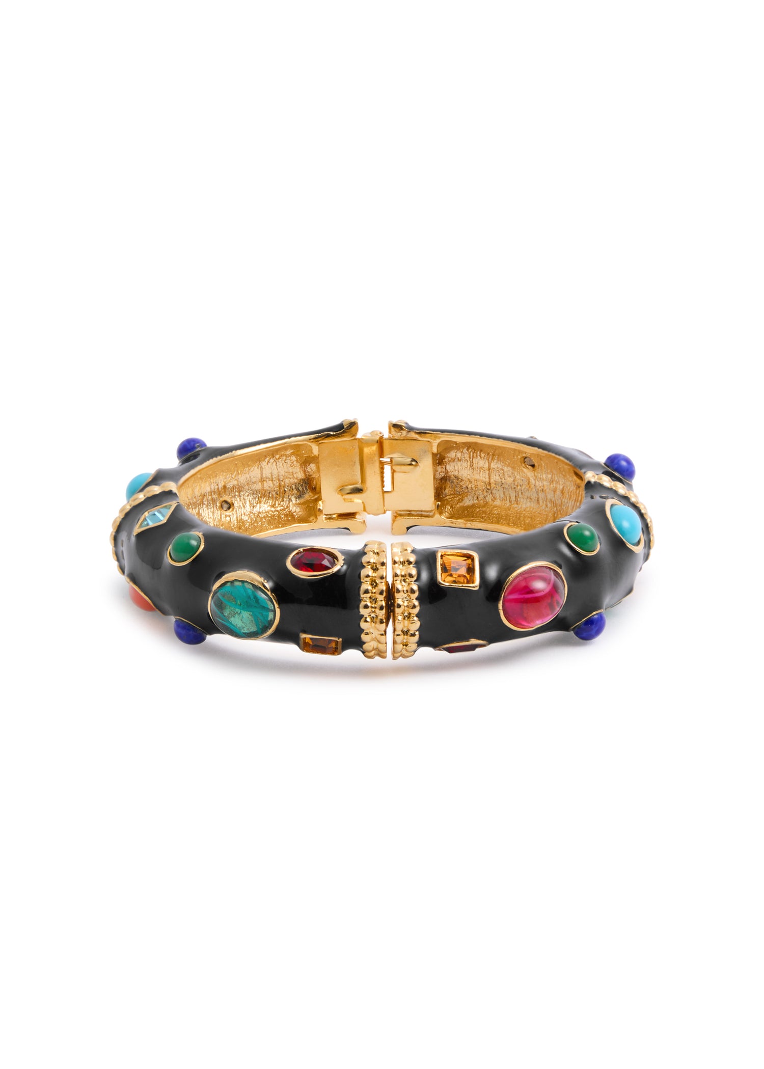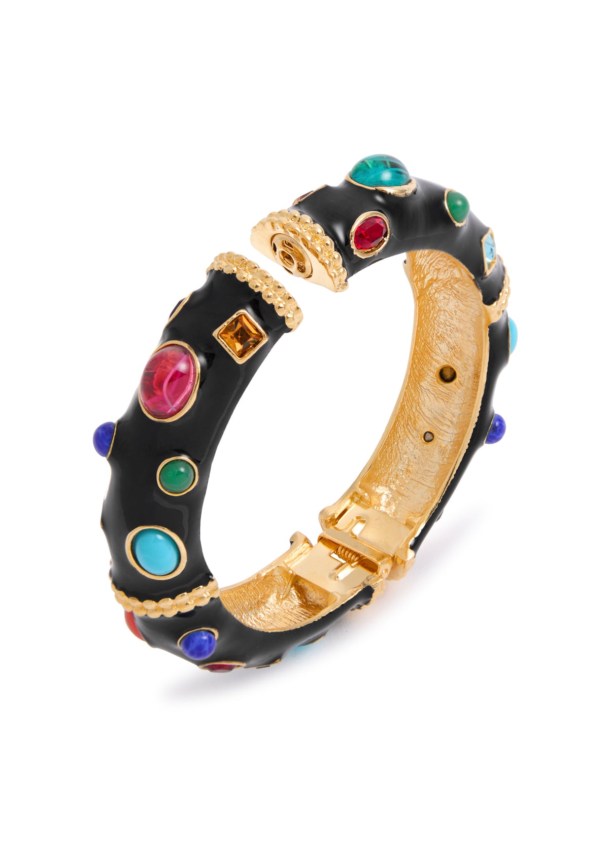 This embellished enamelled bangle by Kenneth Jay Lane offers a bold yet refined look, featuring colorful enamel with gemstone and crystal accents. With textured inserts and a push-stud hinge fastening, this bangle exemplifies Kenneth Jay Lane's glamorous aesthetic, perfect for adding a statement to any ensemble.