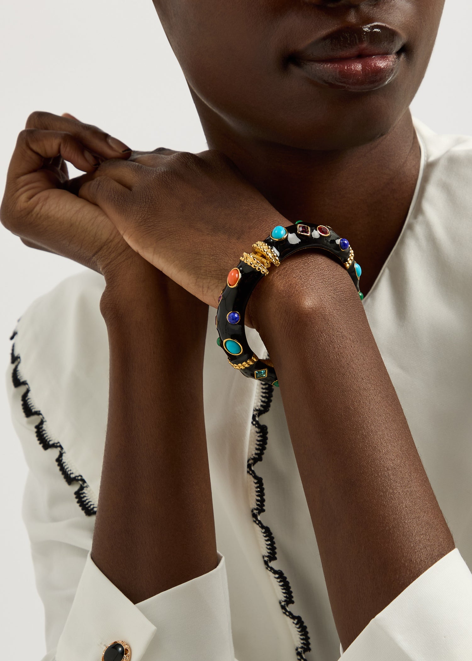 Enamelled with gemstone and crystal embellishments, textured inserts. Push-stud hinge fastening. Inner circumference: 18cm, width: 1.5cm. Presented in a designer-stamped pouch.
