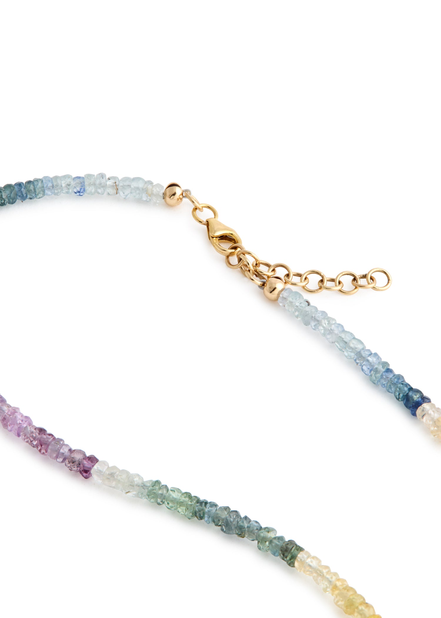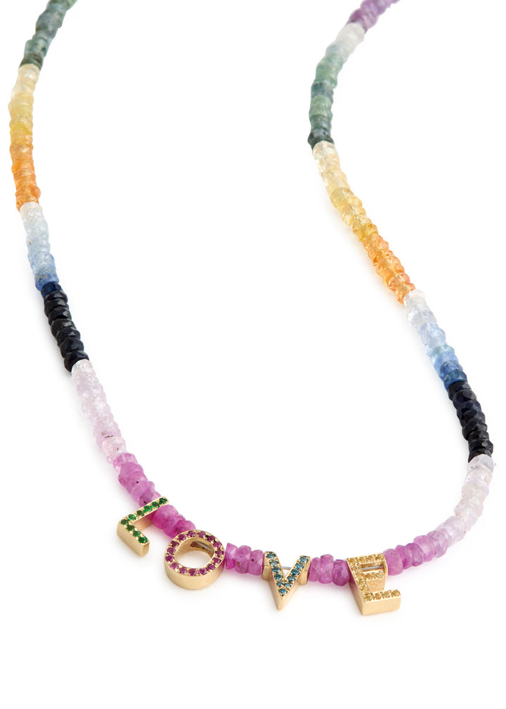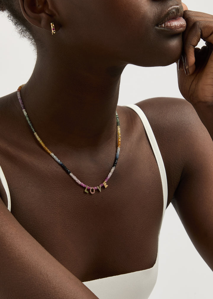 This Rainbow Love sapphire beaded necklace by Roxanne First is a vibrant, playful piece with 9kt gold "LOVE" charms and sapphire crystal embellishments. Ideal for layering or as a standalone piece, it brings a touch of color and charm to any look.