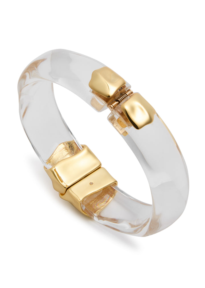 Lucite with molten 14kt gold-plated hardware. Magnetic hinge fastening. Inner circumference: 17cm, width: 1.5cm. Presented in a designer-stamped pouch.