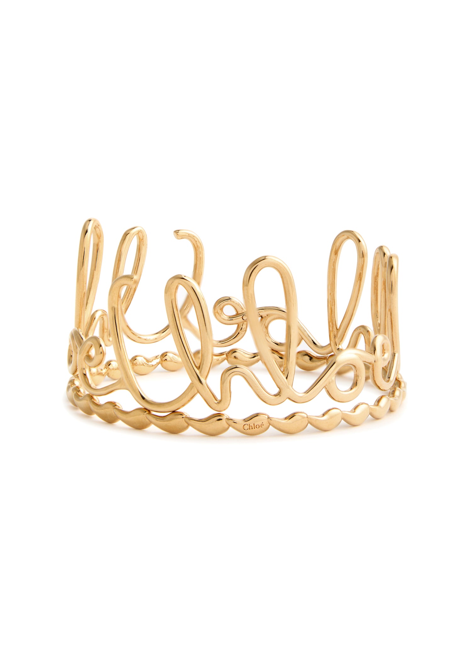 This Iconic logo bangle set by Chloé offers both elegance and versatility, featuring two bangles: one with a logo design and the other with a delicate scalloped edge. Together, they create a chic, layered look that reflects Chloé’s romantic, bohemian style.