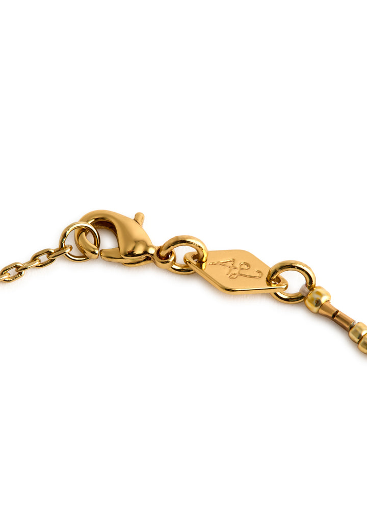 18kt gold-plated brass with glass beads and a designer-engraved tag. Adjustable lobster-clasp fastening. Length: 16-18cm. Presented in a designer-stamped box.