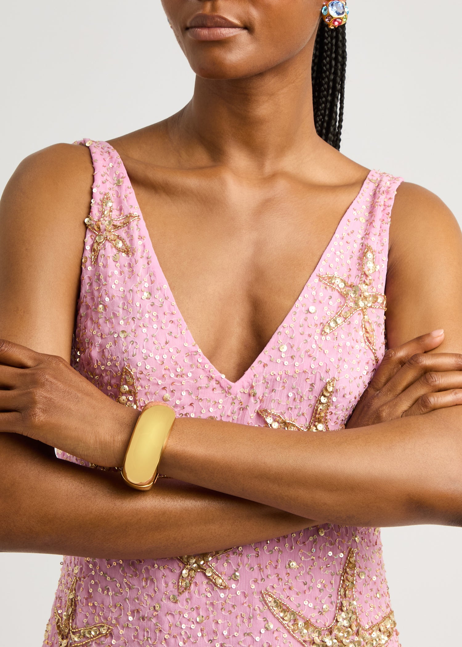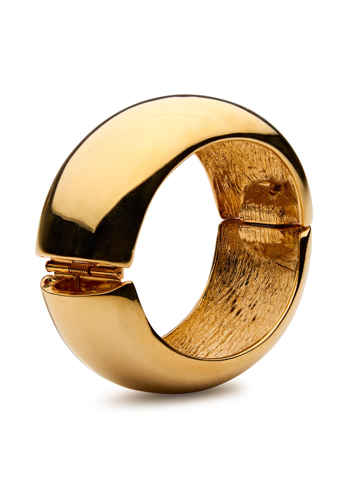 Metal with a polished domed design and magnetic hinged closure. Inner circumference: 16cm, Width of band: 3cm. Presented in a designer-stamped pouch.