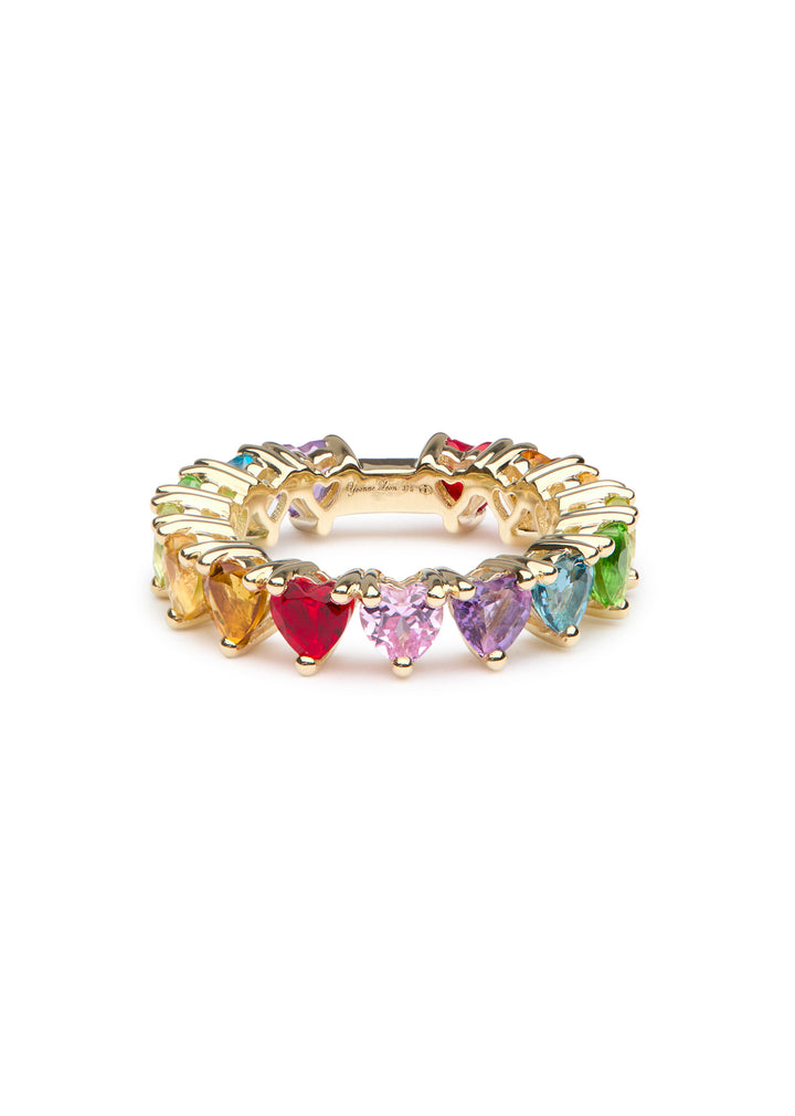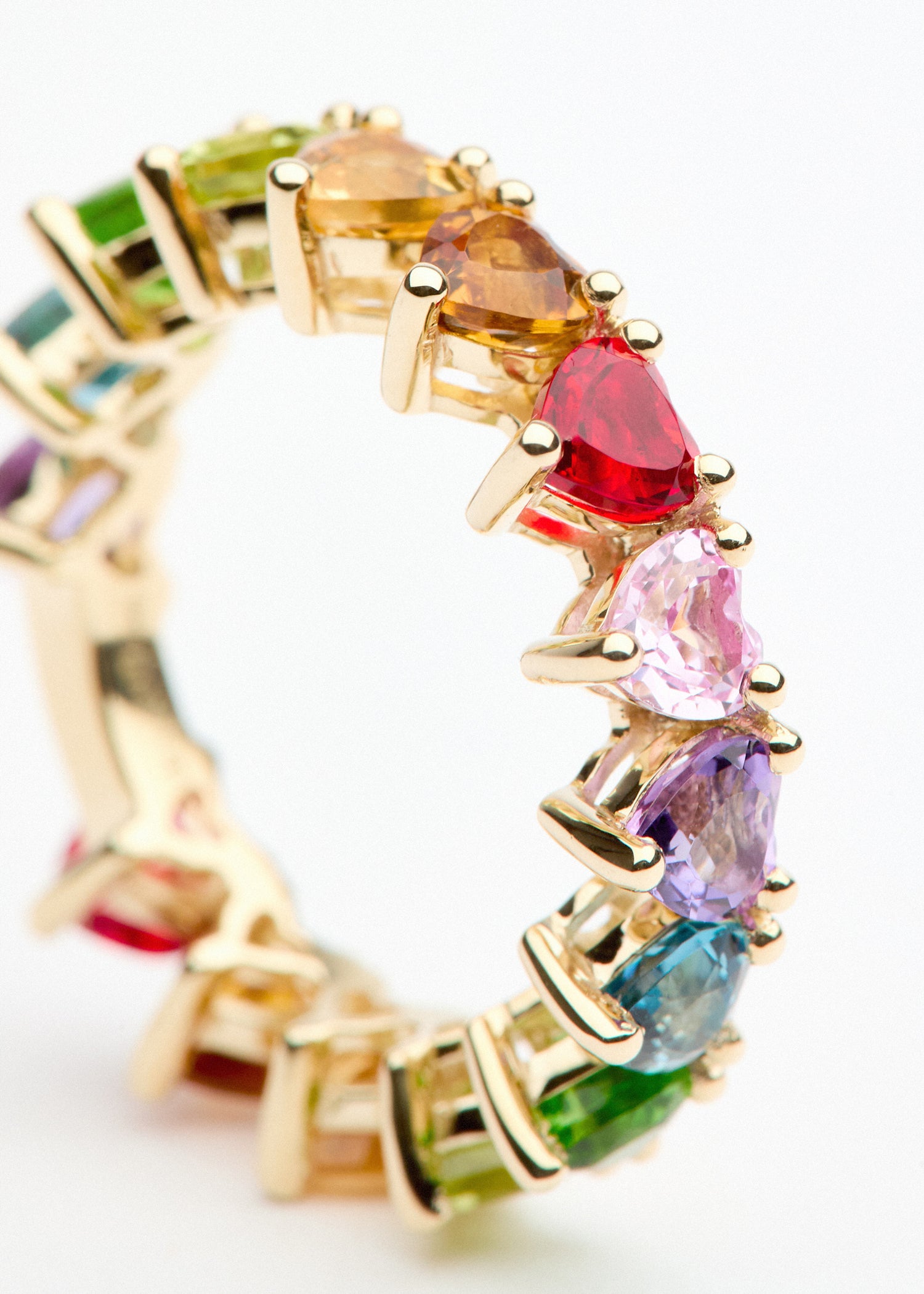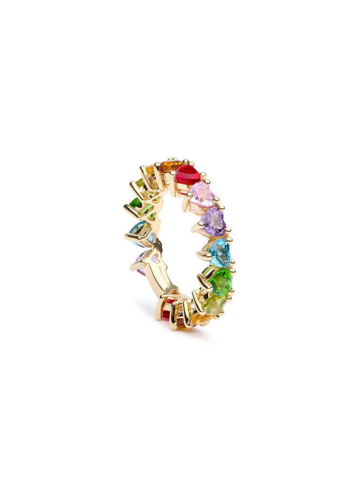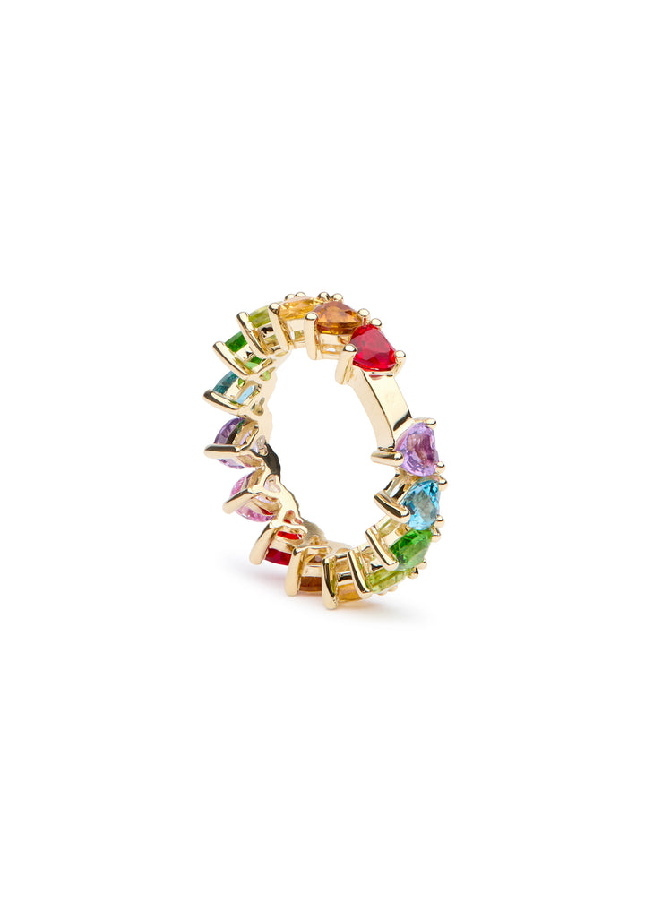 9kt gold with rainbow heart-shaped crystals (amethyst, citrine, yellow citrine, peridot, blue topaz, pink glass, green glass, red glass). Width of band: 0.5cm. Presented in a designer-stamped box.
