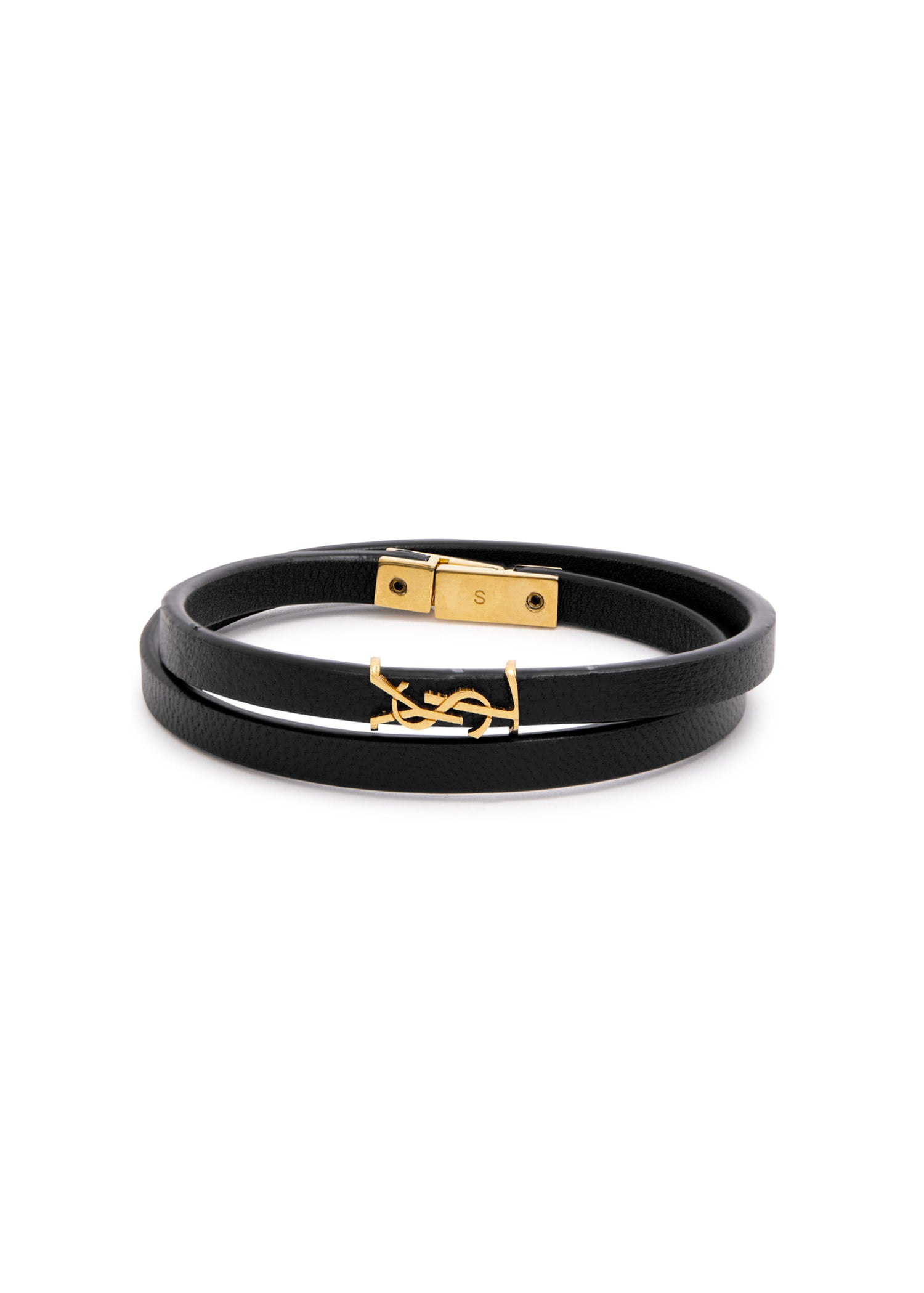 The Cassandre Leather Wrap Bracelet by Saint Laurent embodies rock-chic sophistication with a double wrap design and designer plaque. This leather bracelet is perfect for adding an edgy, Parisian touch to any look.