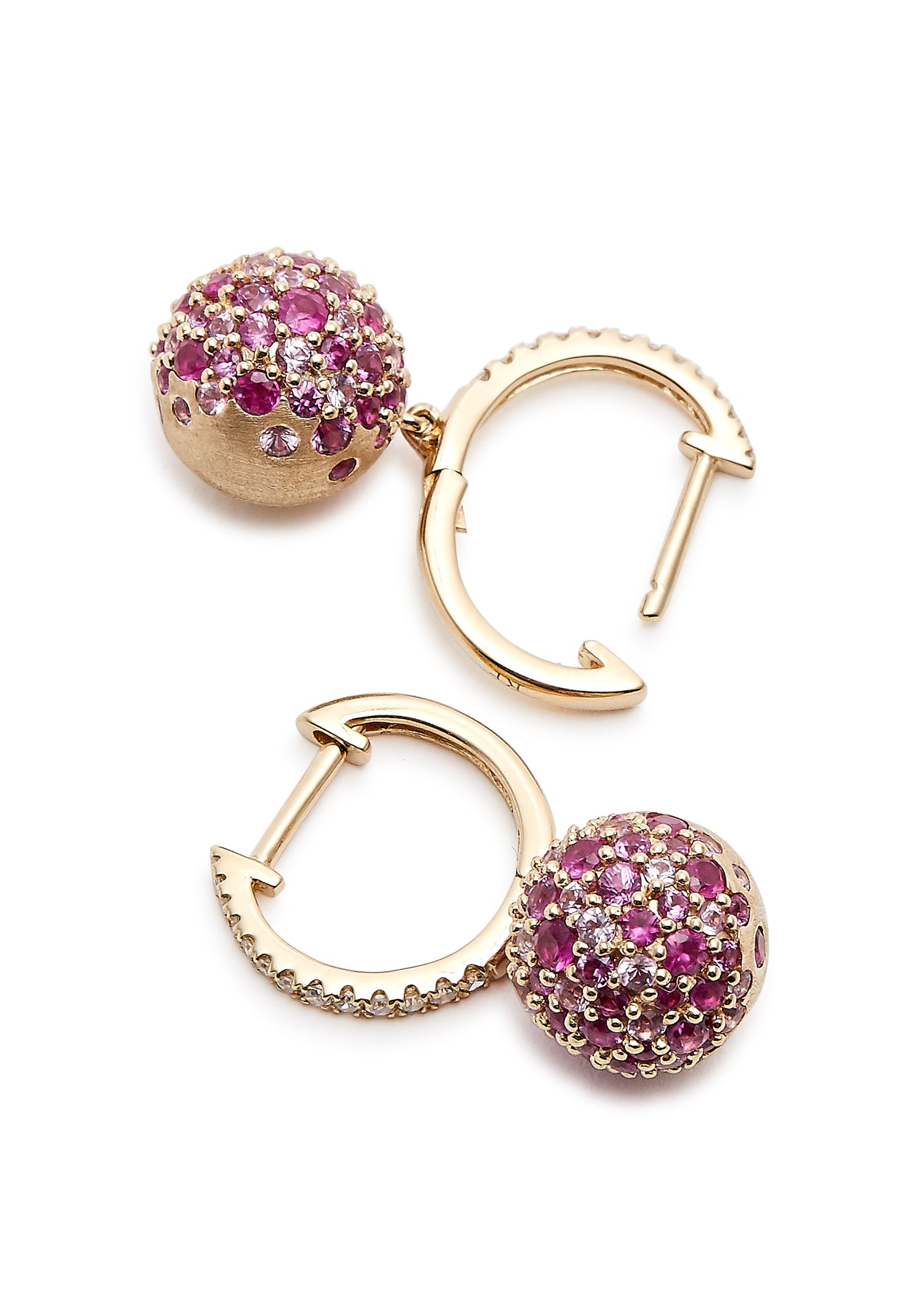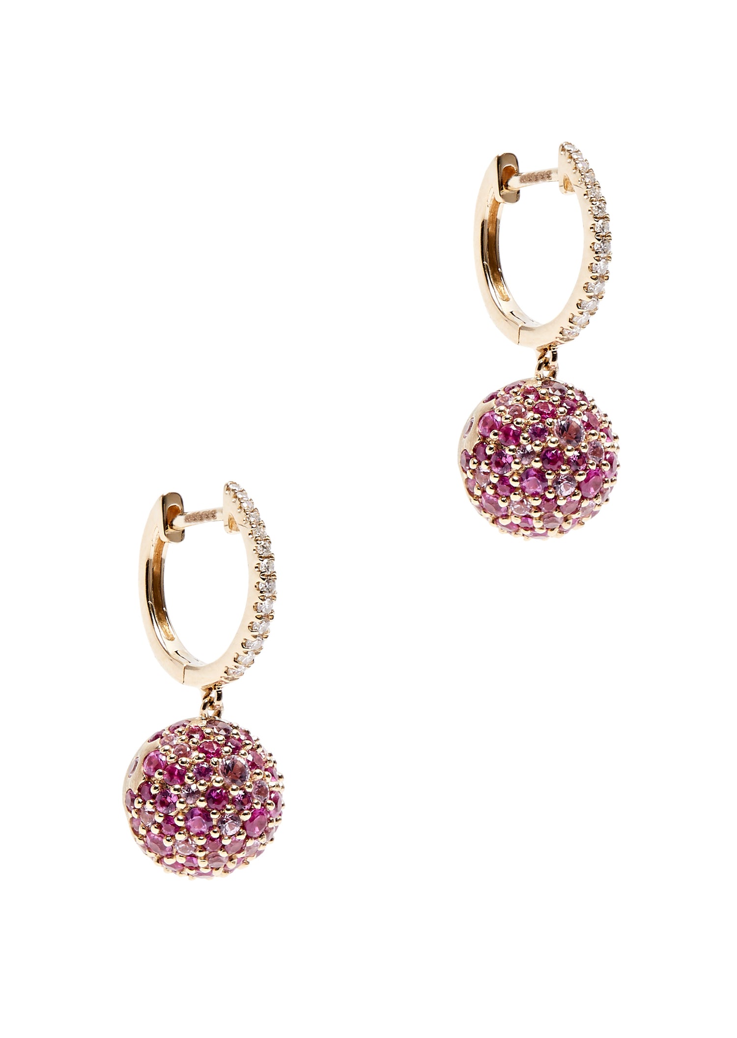 Crafted in 14kt gold with bauble charms, adorned with diamond and sapphire embellishments. Sleeper fastening for pierced ears. Drop: 2 cm.