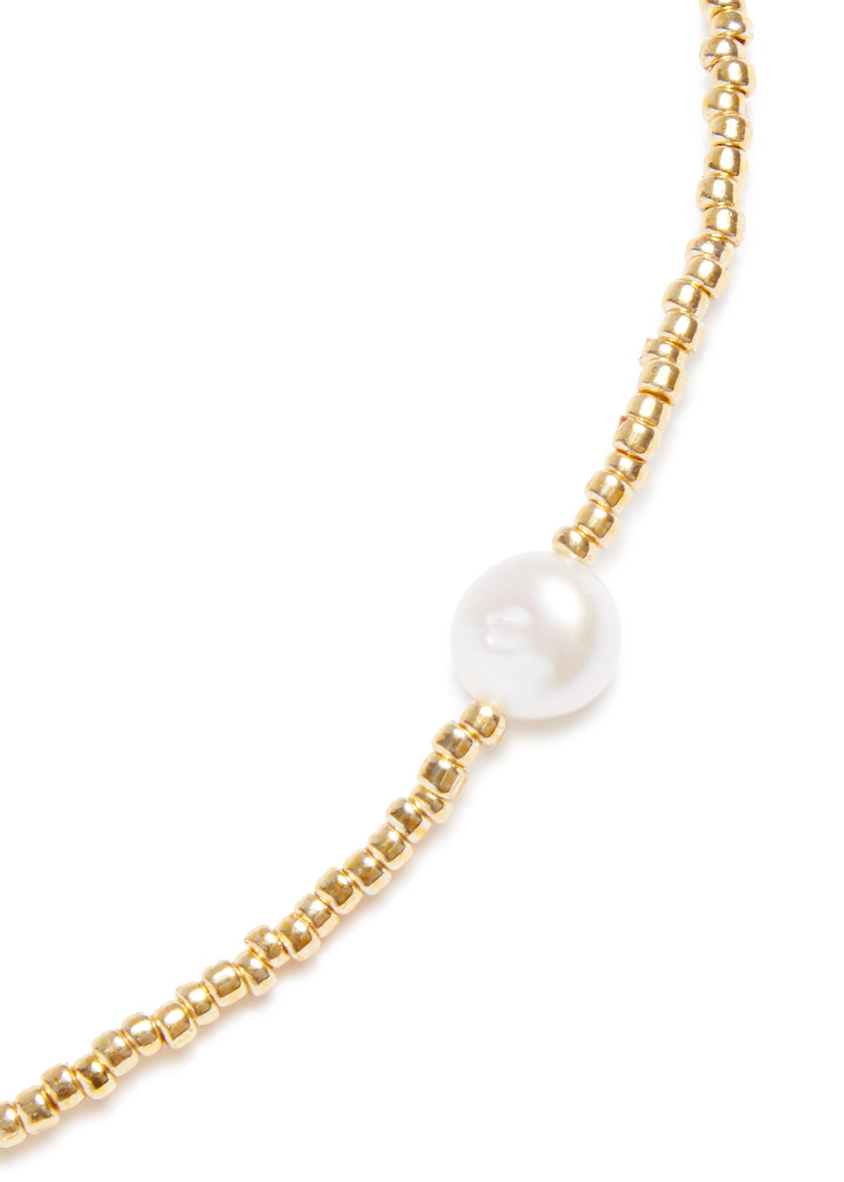 Handmade in 18kt gold-plated metal with glass bead design and freshwater nugget pearl embellishment. Adjustable lobster clasp. Length: 16-18 cm.