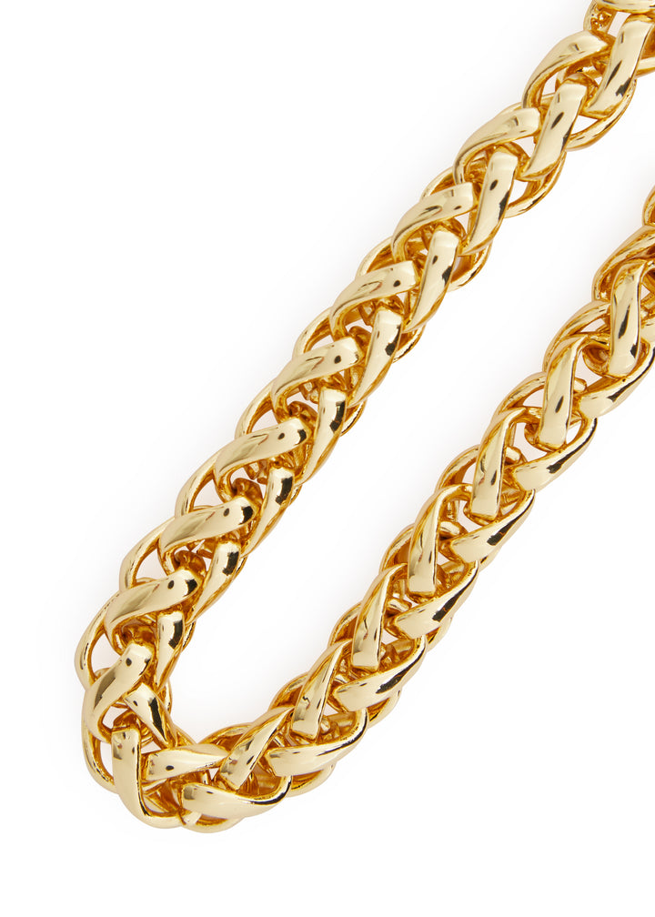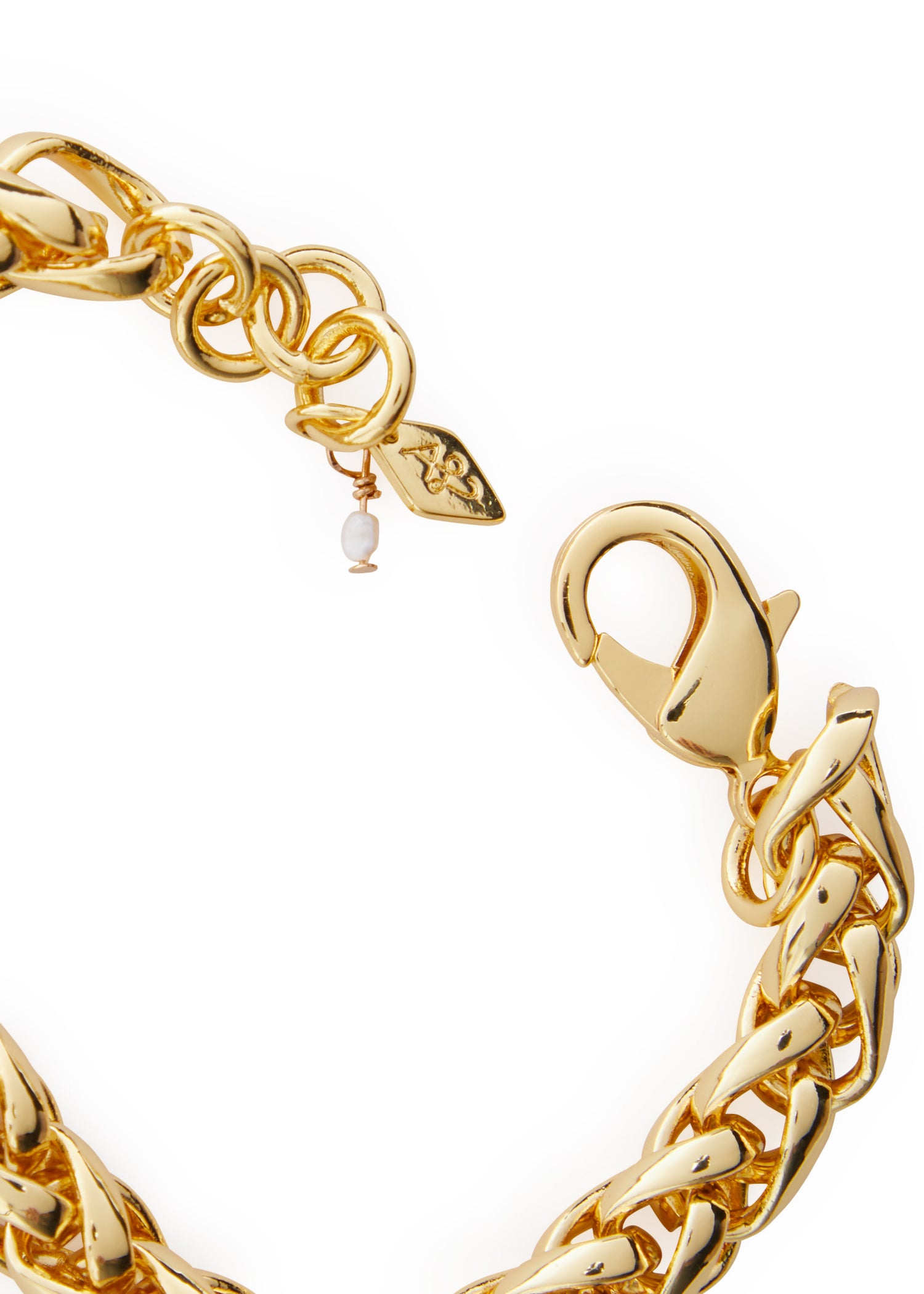 Made in gold-plated metal with a chunky chain design and freshwater rice pearl embellishment. Adjustable lobster clasp. Length: 18-21 cm.