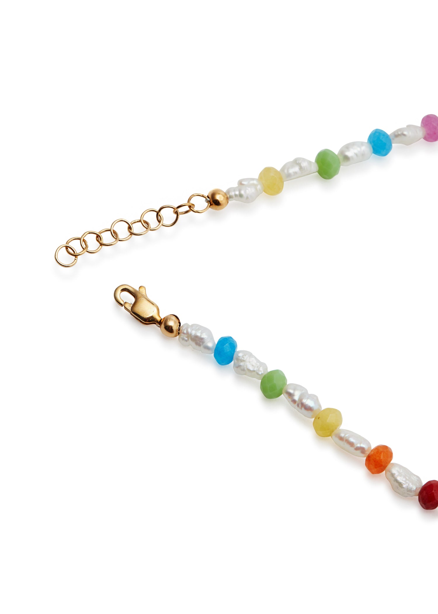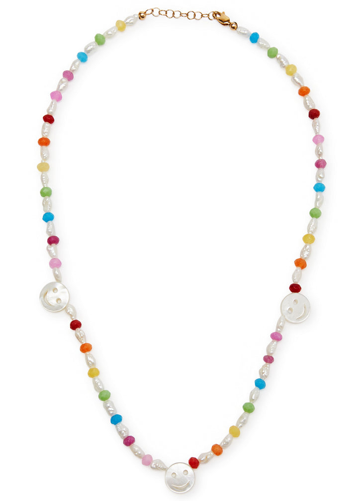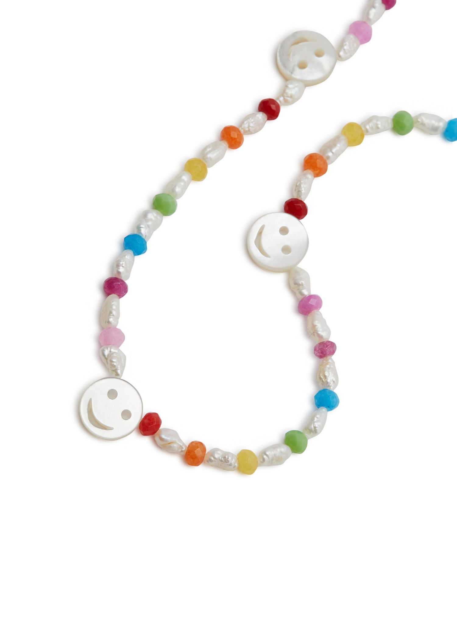Crafted with rice pearls, sapphire bead embellishments, and mother of pearl Happy Face charms. Features 9kt gold hardware and an adjustable lobster clasp. Length: 39.5 cm.