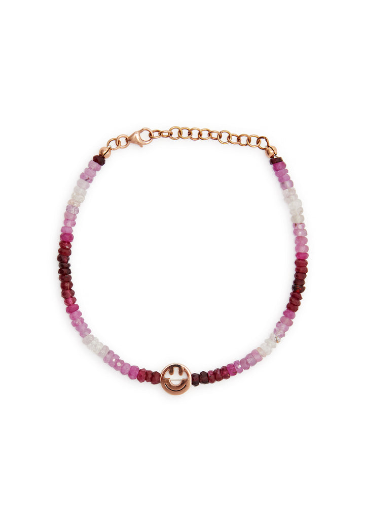 Made with sapphire beads, 9kt gold or white gold hardware, and a Happy Face charm. Adjustable with a lobster clasp. Length: 19 cm.
