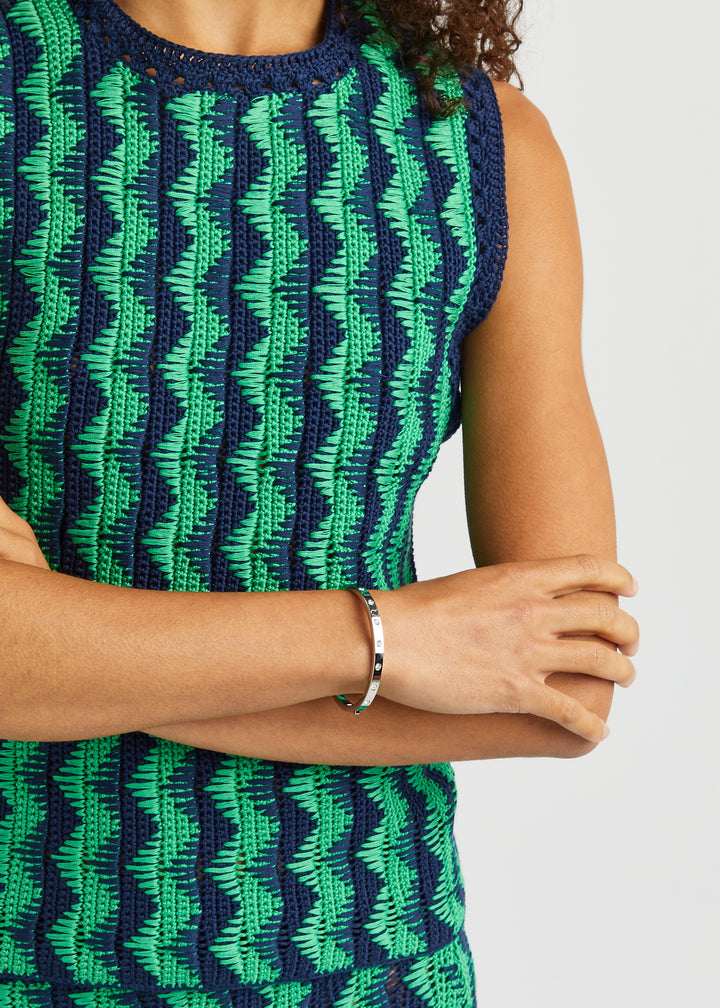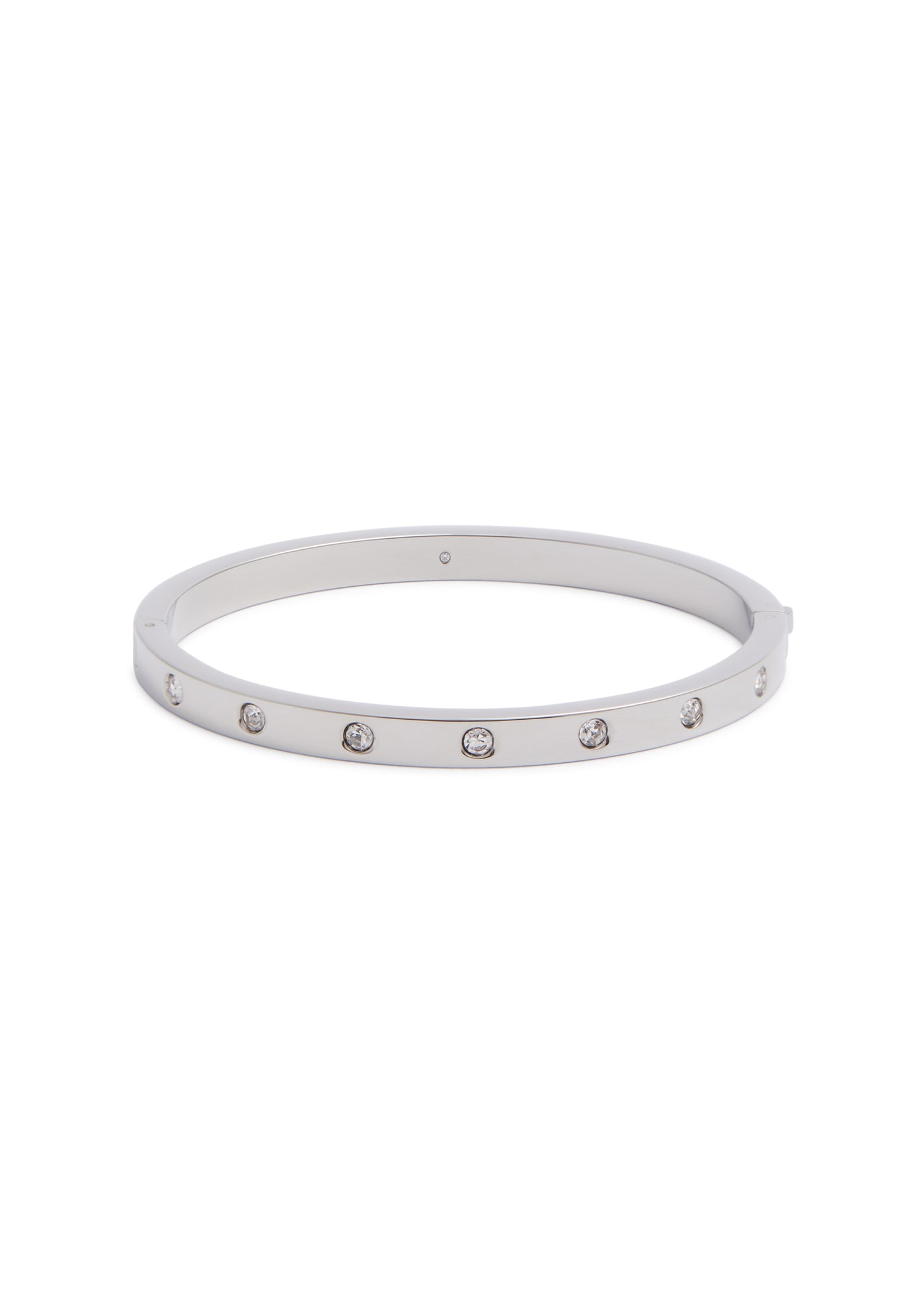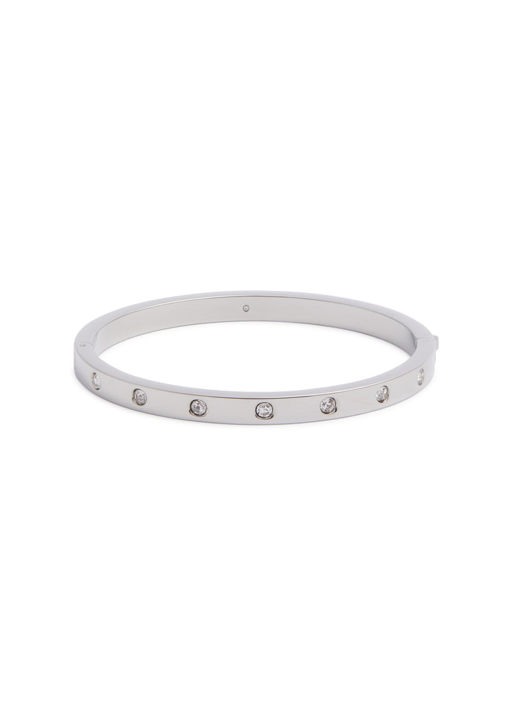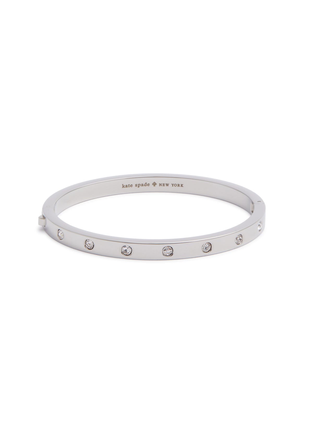 This Set In Stone silver-plated bracelet by Kate Spade New York offers a sophisticated sparkle with its crystal embellishments. Featuring a classic push-lock hinge fastening, this piece blends elegance with a playful touch, ideal for adding a bit of shine to any look.