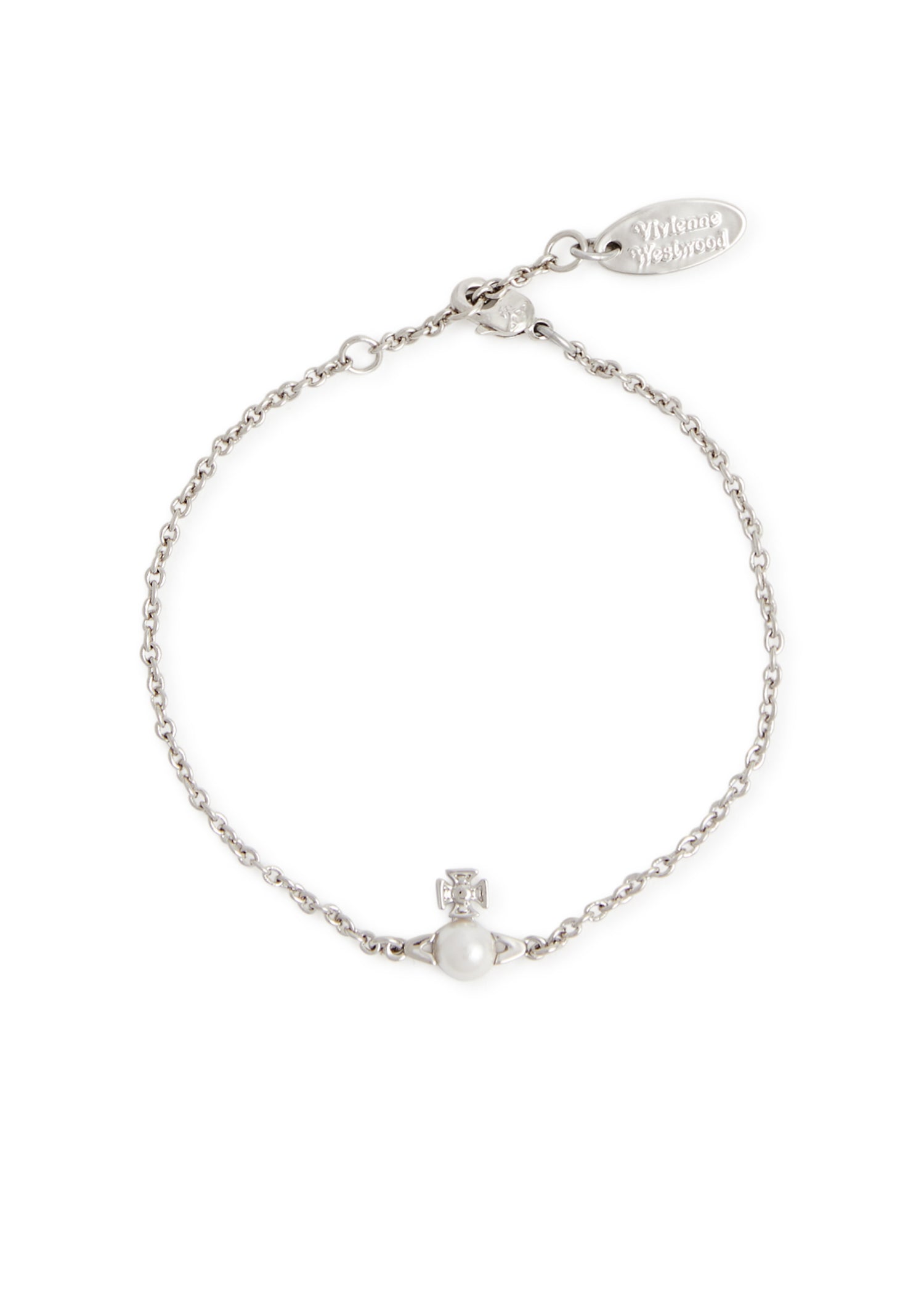 Crafted in metal with a glass pearl-embellished orb plaque, designer tag, and adjustable lobster clasp. Length: 15.5-17.5 cm; Orb dimensions: 0.5 cm x 1 cm.