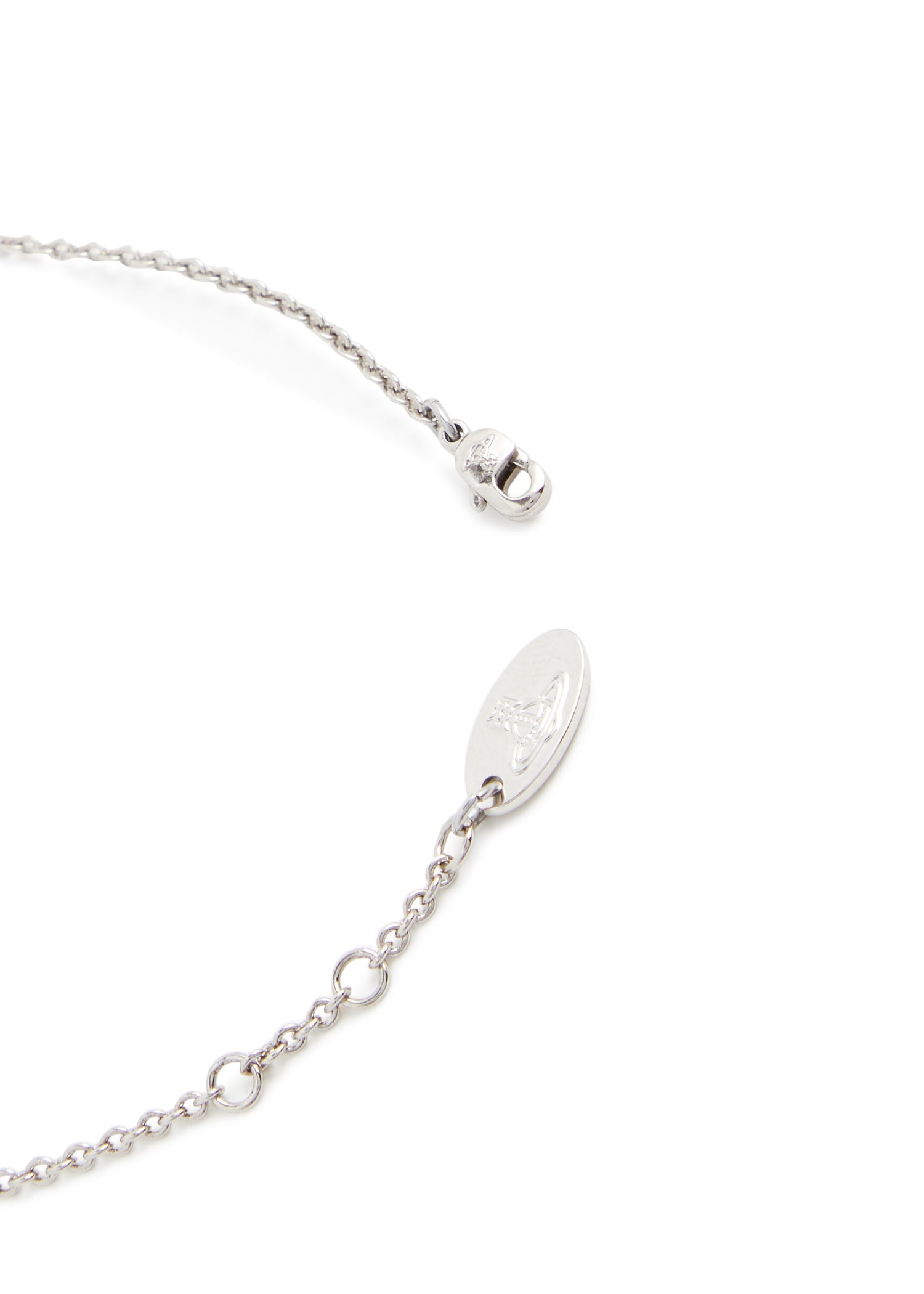 This Balbina orb bracelet by Vivienne Westwood showcases the brand’s iconic rebellious style with a glass pearl-embellished orb plaque. Its adjustable fit and signature designer tag make it an edgy yet elegant statement accessory that adds a bold touch to any look.