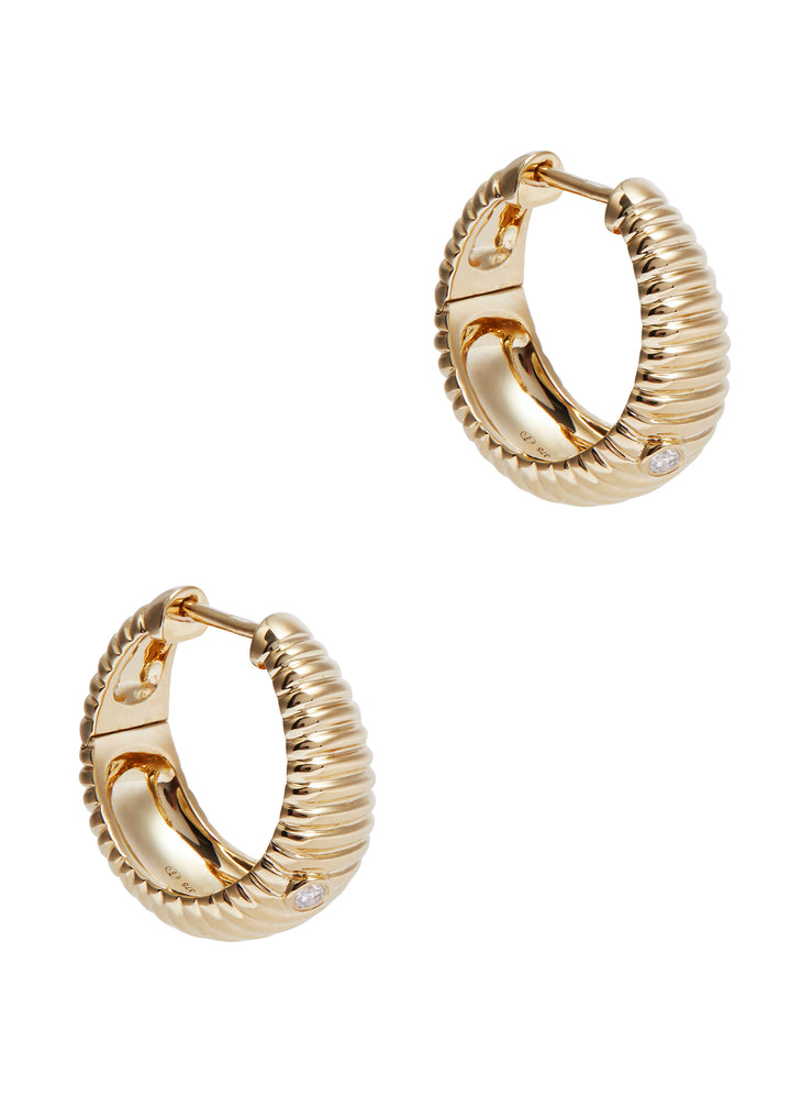 These Paires De Creoles Berlingot 9kt gold hoop earrings by Yvonne Léon feature a ribbed design and diamond accents, capturing the brand’s playful yet sophisticated essence. With a classic sleeper fastening, they make a bold yet elegant statement for any occasion.