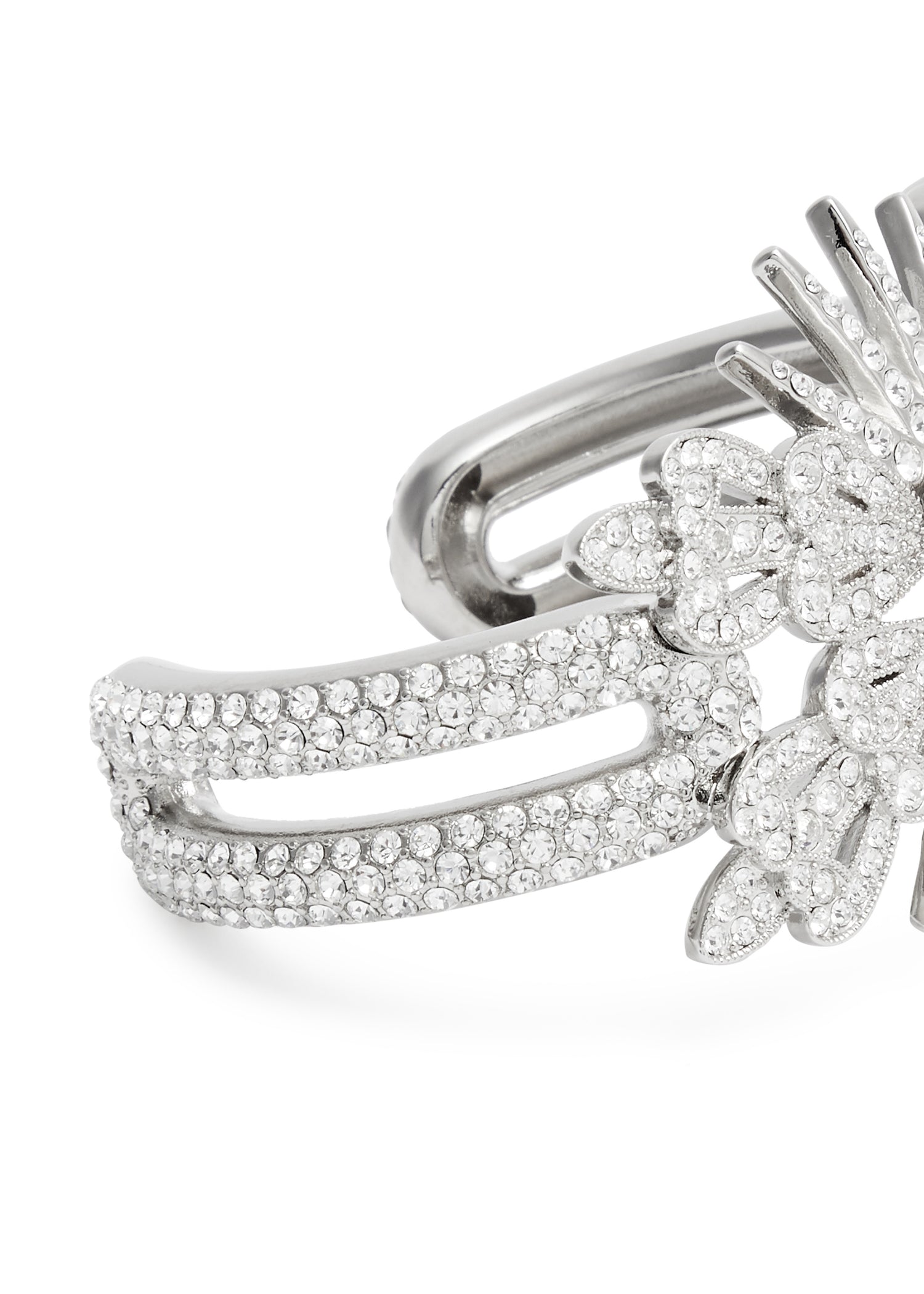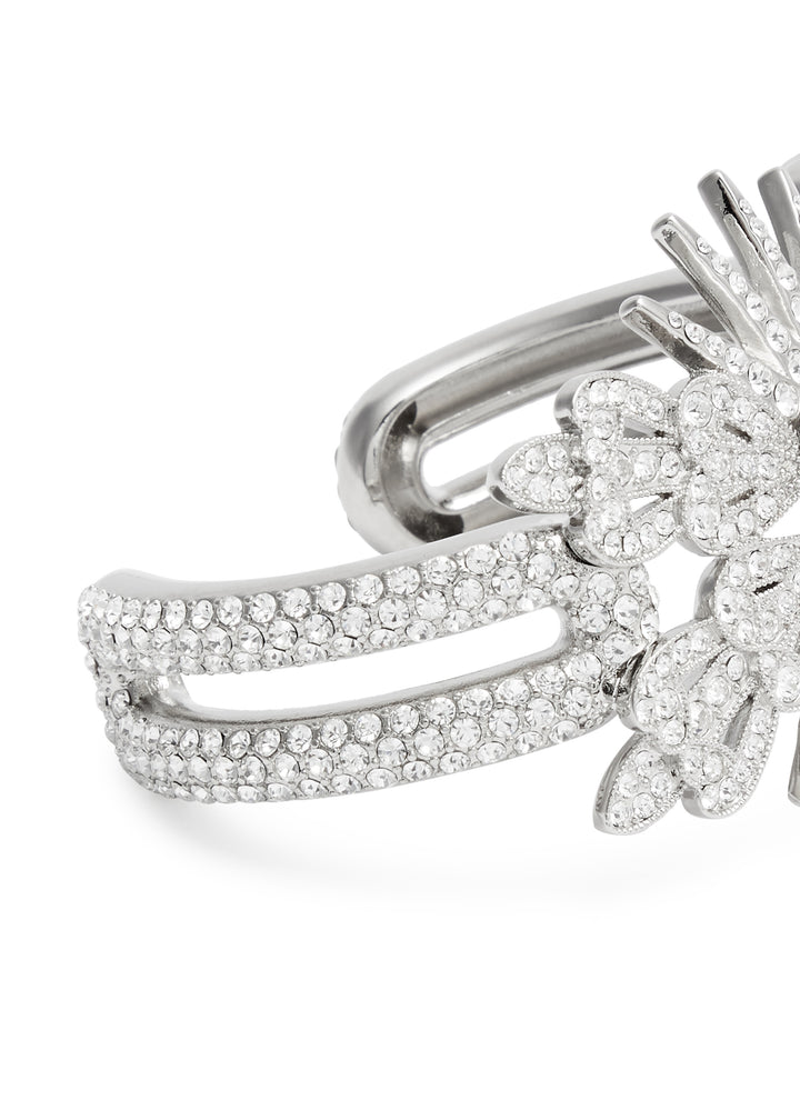 Crafted in silver-tone with crystal embellishments in a floral design. Floral dimensions are 7 cm x 5.5 cm, with a width of 1.6 cm. Presented in a designer-stamped box.