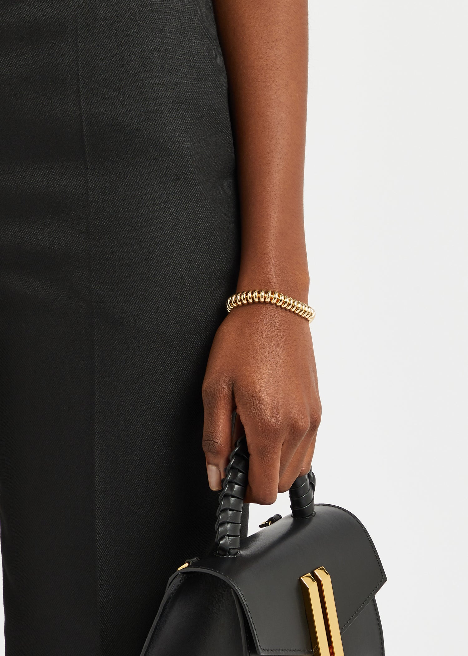 Gold-dipped with a ribbed chain link design, featuring designer engraving. Clasp fastening, width of 1 cm and length of 17.5 cm. Presented in a designer-stamped box.