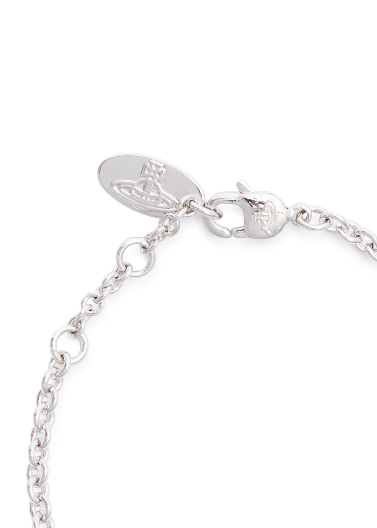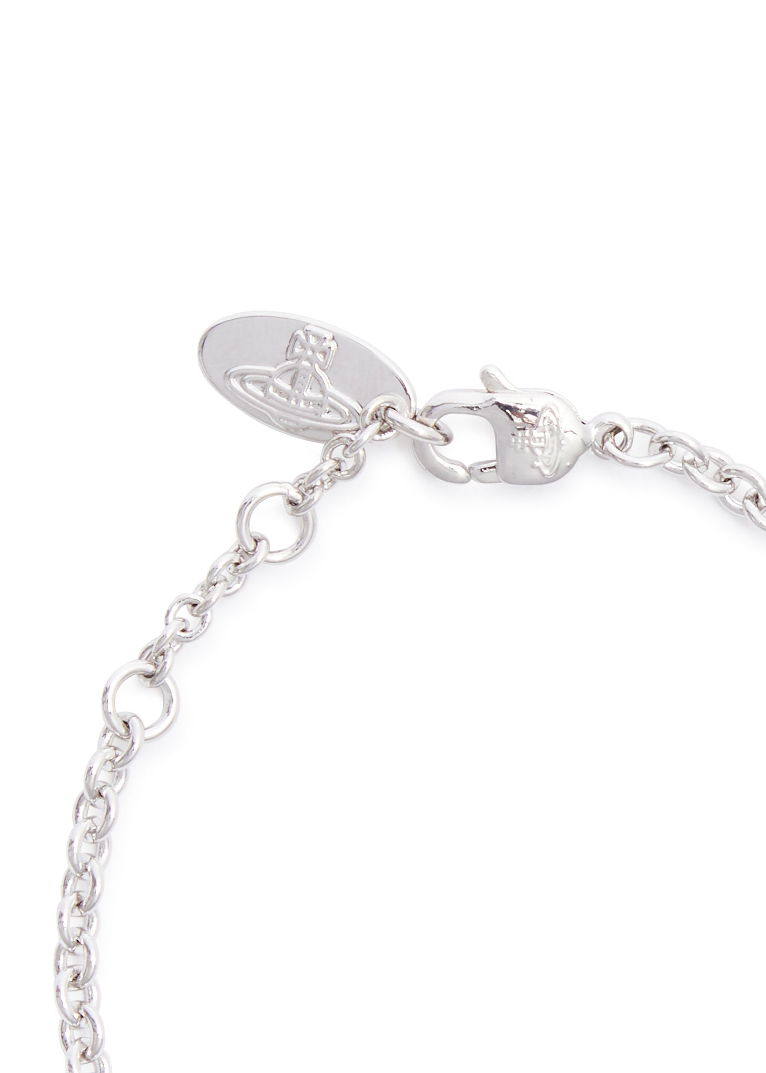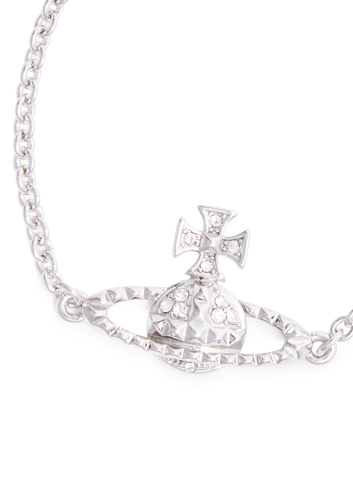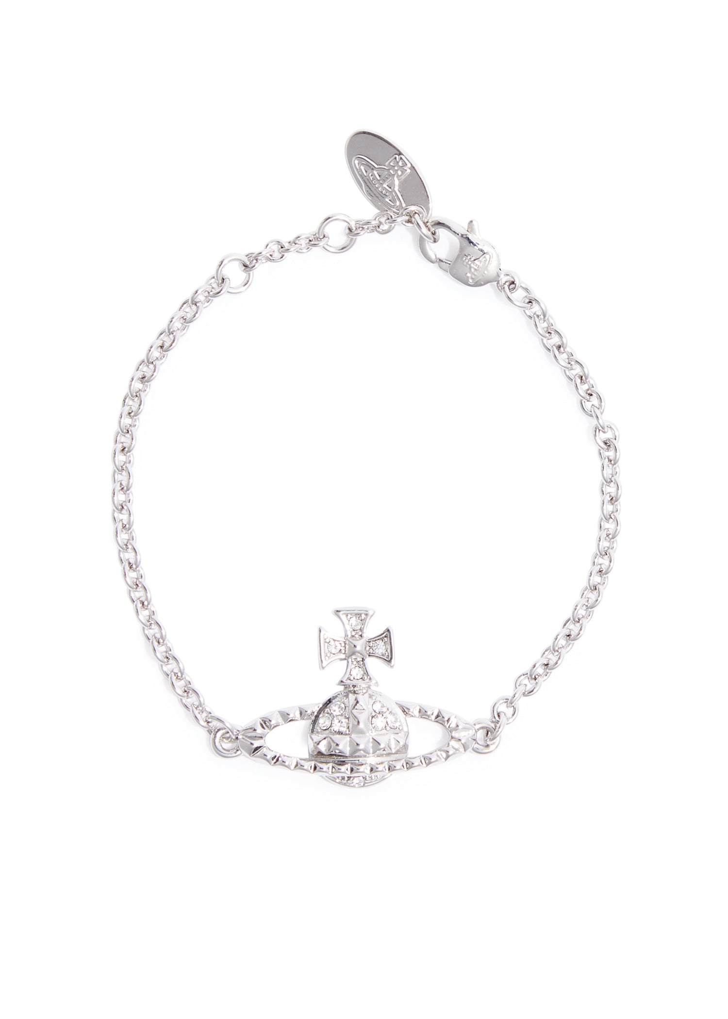 Silver-tone chain bracelet with a crystal-embellished orb plaque, designer-engraved hanging tag, and adjustable lobster clasp fastening. Minimum length of 15 cm and maximum length of 17.5 cm, with orb dimensions of 3 cm x 2 cm.
