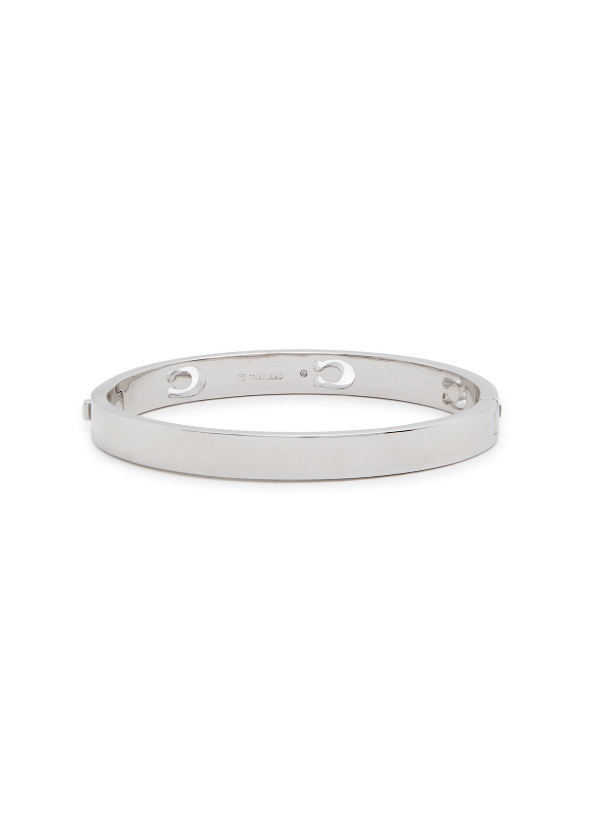Crafted in silver-tone with crystal embellishments and a cut-out logo. Push-clasp hinge fastening with a width of 0.7 cm. Presented in a designer-stamped pouch.