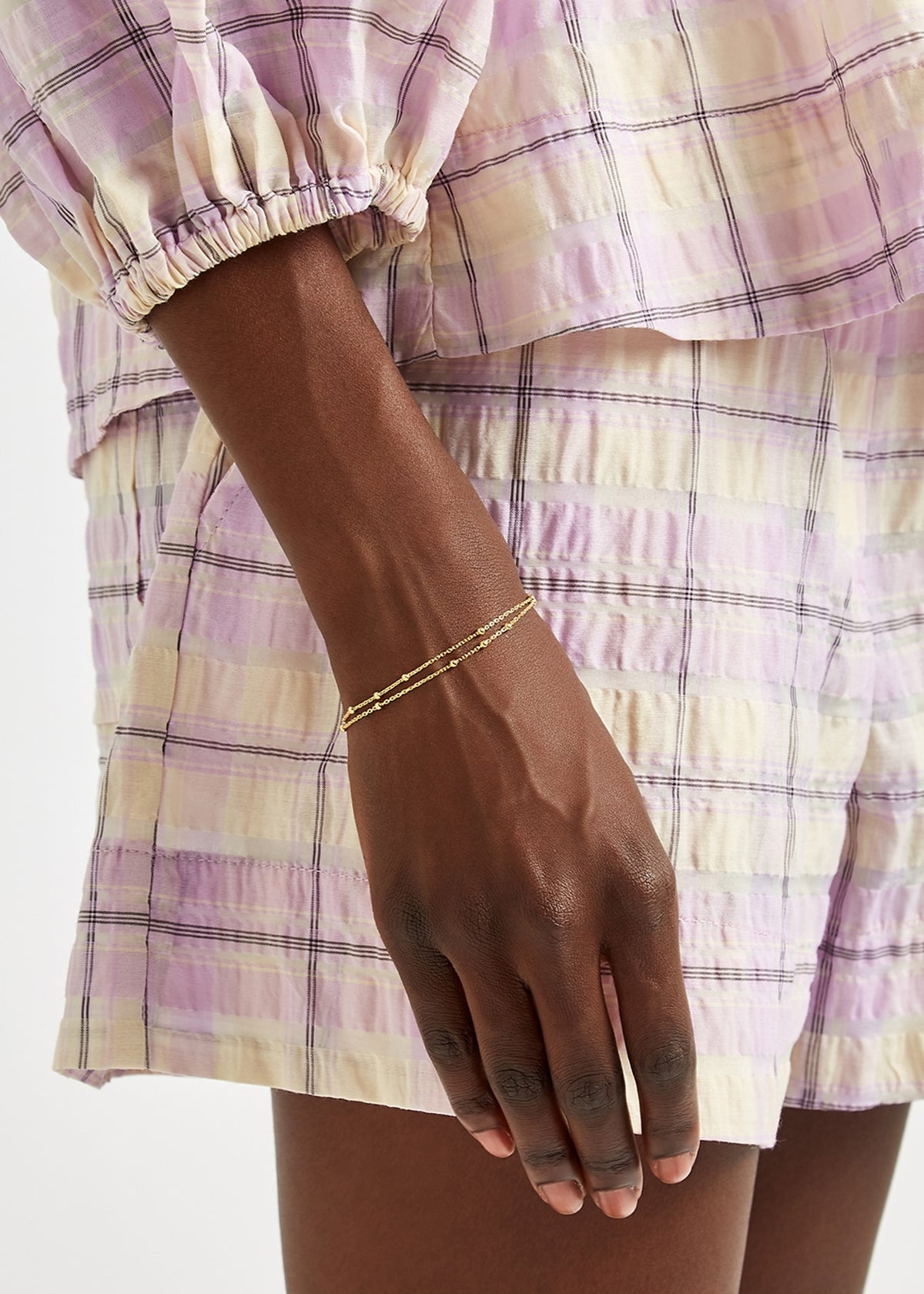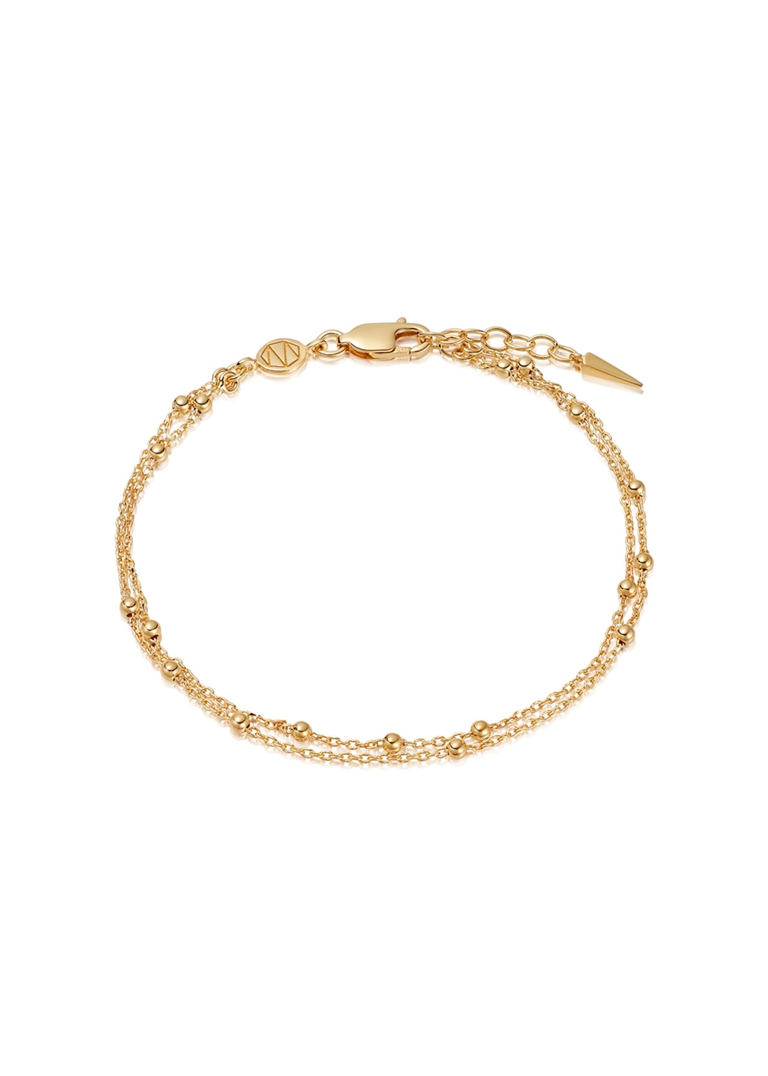 Crafted in 18kt gold vermeil with a double bracelet design, bead embellishments, and a designer tag. Lobster clasp fastening with an adjustable inner circumference of 16 cm to 17 cm. Presented in a designer-stamped box.