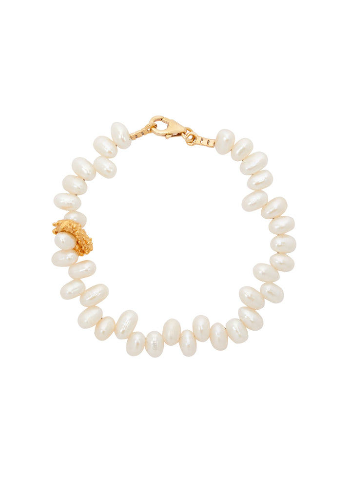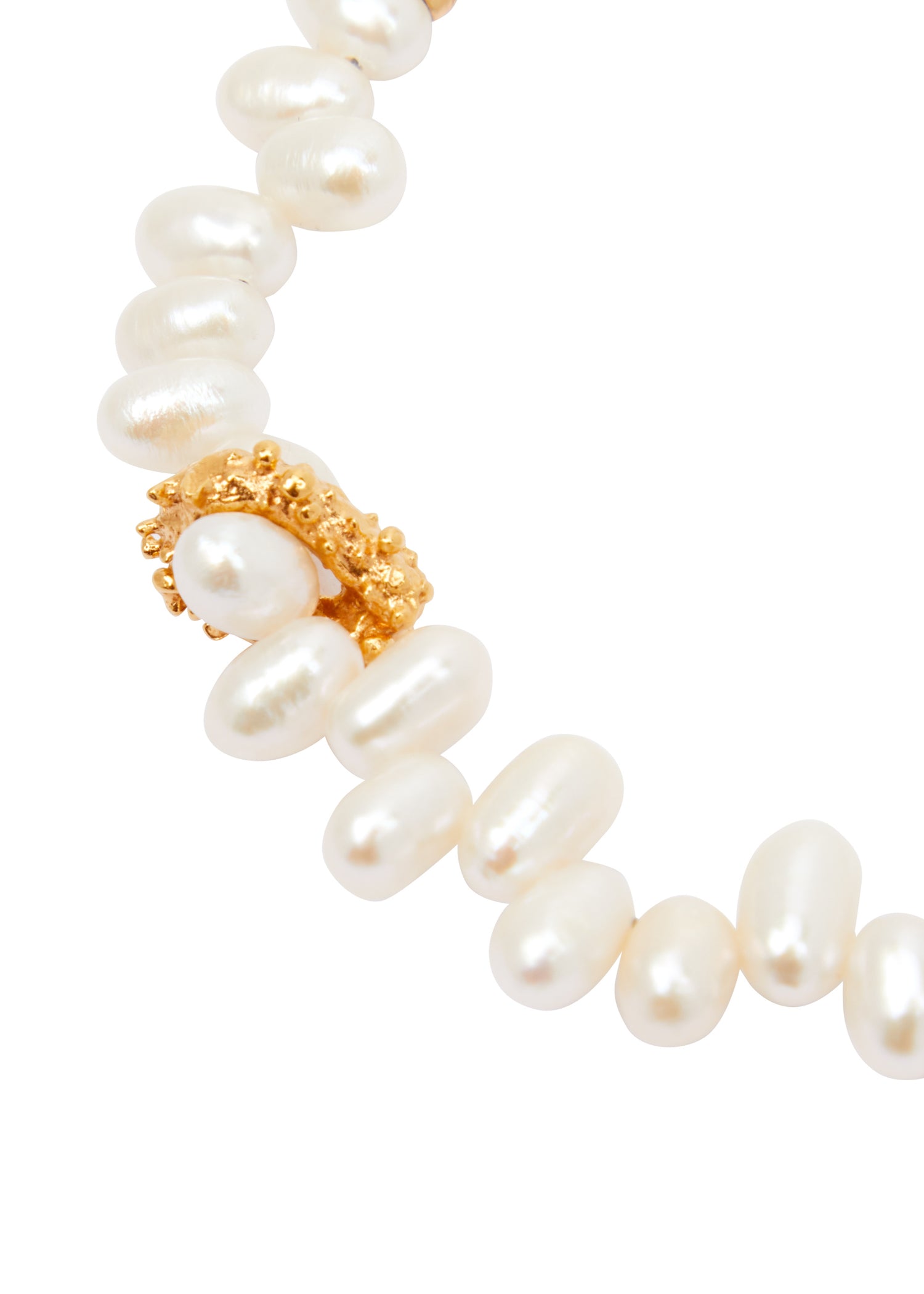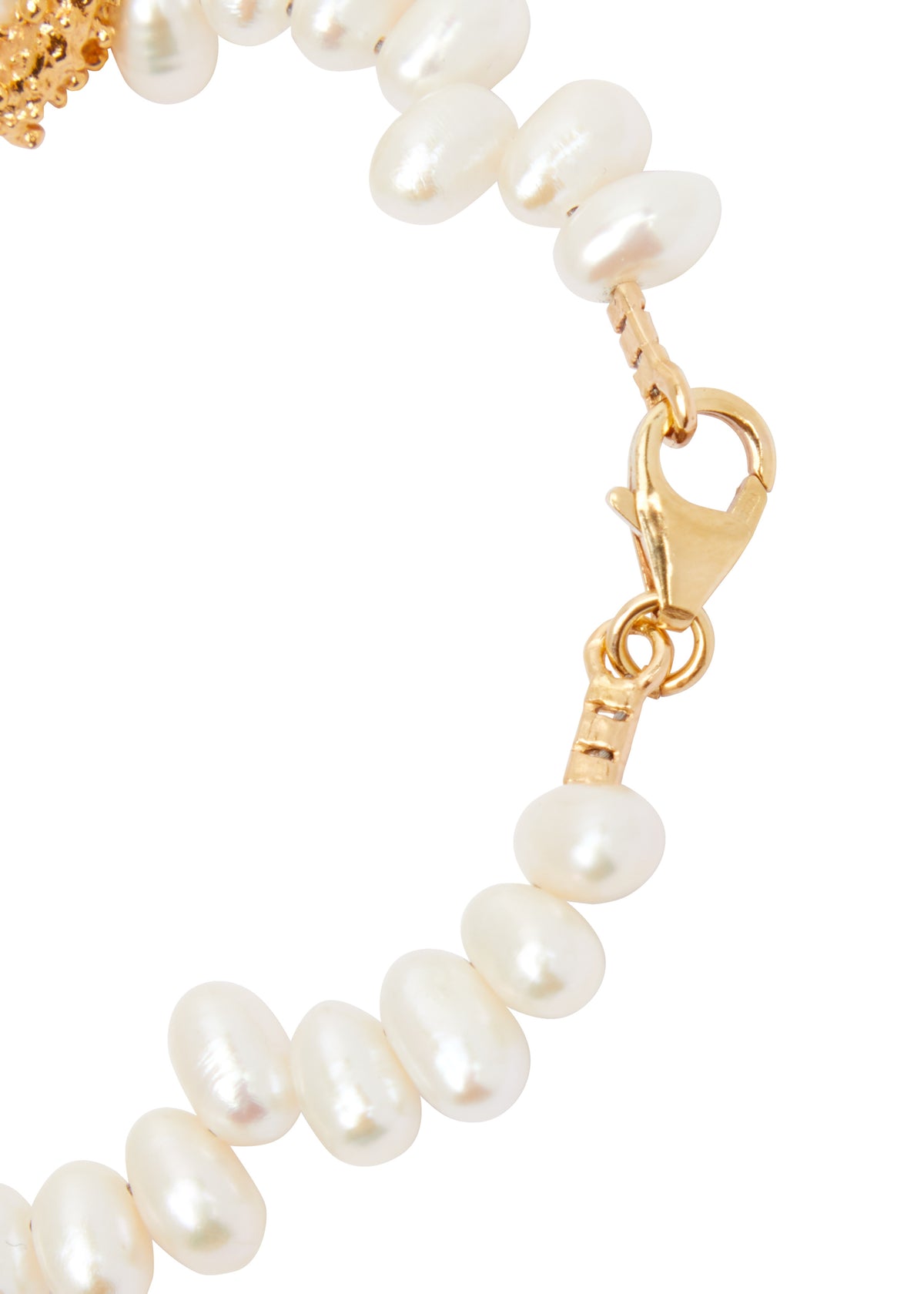Handmade with 24kt gold-plated bronze hardware, adorned with freshwater pearls and a textured charm. Secured with a lobster clasp fastening, total length of 19 cm. Presented in a designer-stamped box.