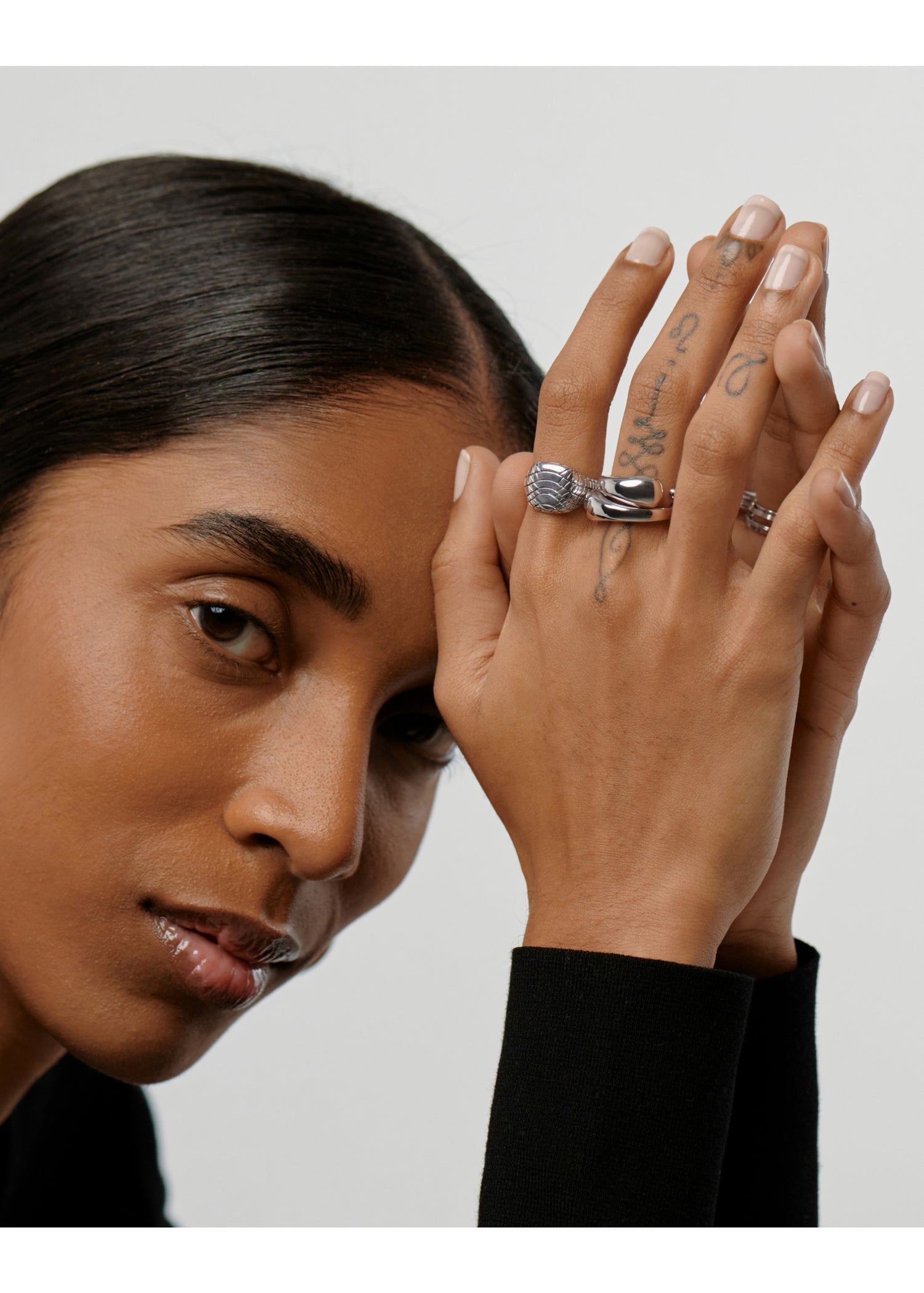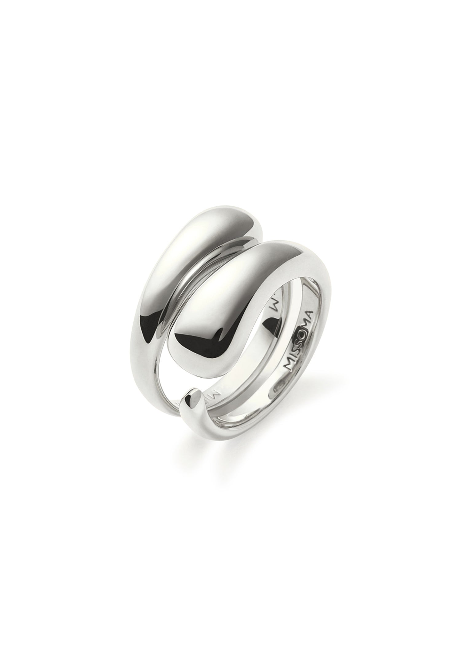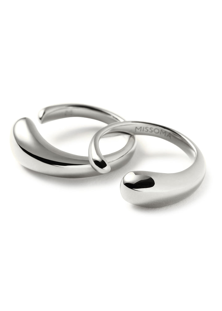 These Molten Silver-Plated Stacking Rings by Missoma are crafted for layering, featuring a sculpted, modern design that enhances versatility. Ideal for daily wear, these rings embody Missoma's signature chic aesthetic, making a sophisticated addition to any jewelry collection.