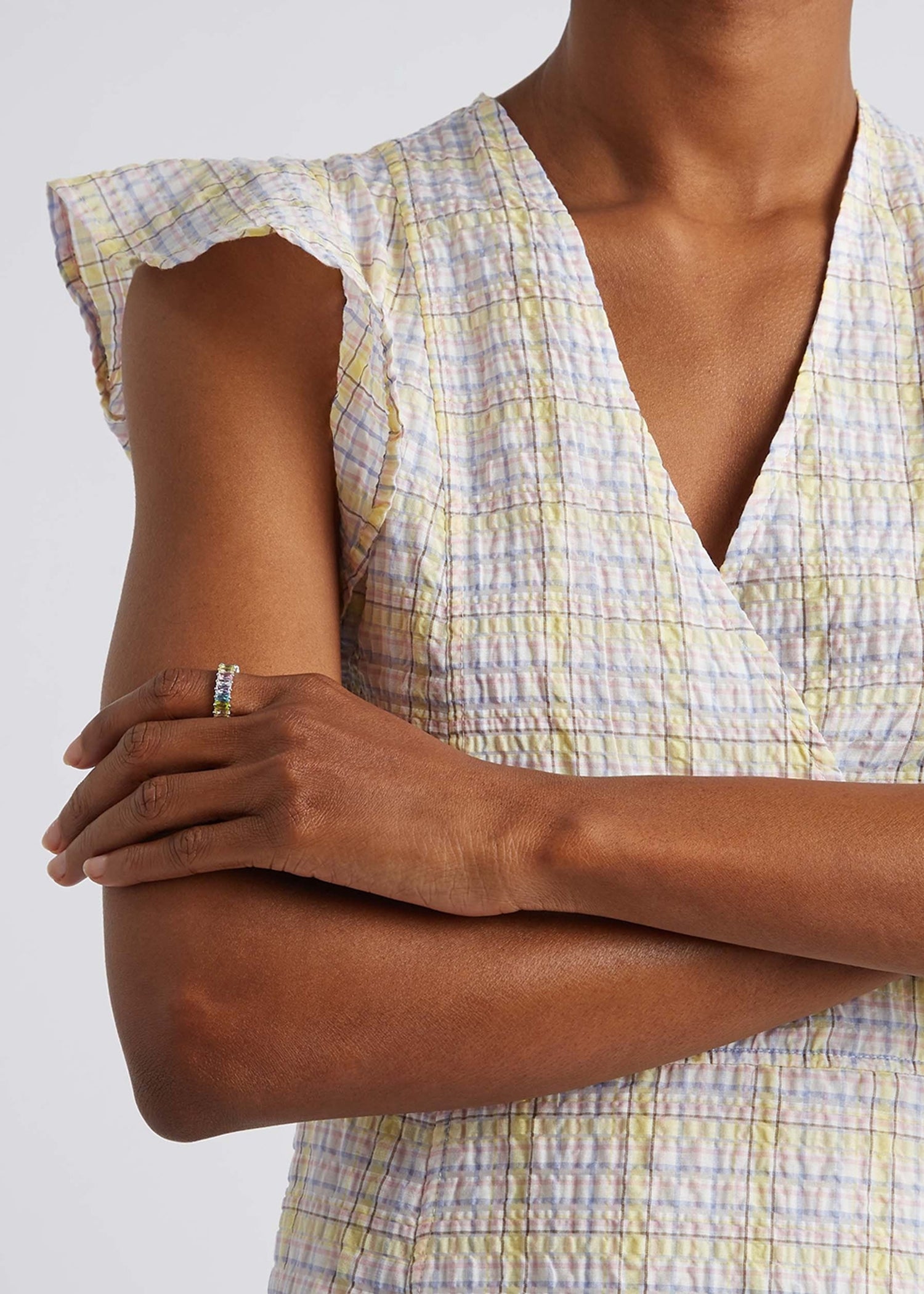 This Crystal-Embellished White Rhodium-Plated Ring by Rosie Fortescue offers a fresh take on colorful luxury, featuring pastel emerald-cut cubic zirconia in a multicolored palette. Perfect for adding a playful elegance to any outfit, it captures Rosie Fortescue’s contemporary and eye-catching design ethos.