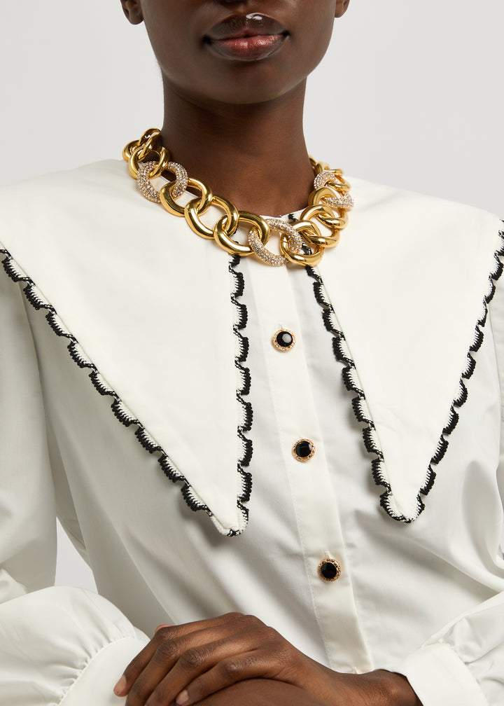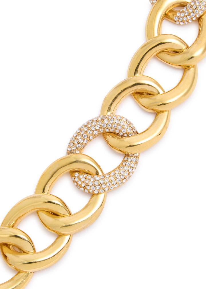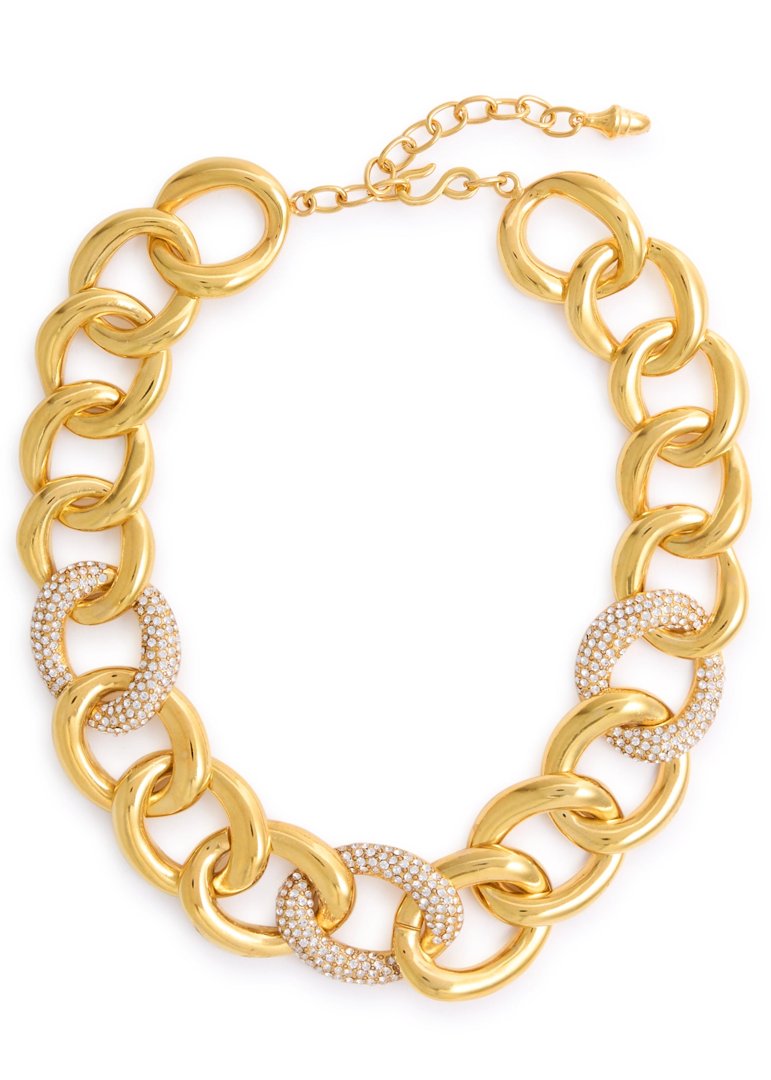 This Crystal-embellished Chain Necklace by Kenneth Jay Lane adds glamour with its chunky chain and pavé crystal detailing, embodying the brand’s signature luxurious, statement-making style. Ideal for those seeking an accessory that brings elegance with a touch of boldness.