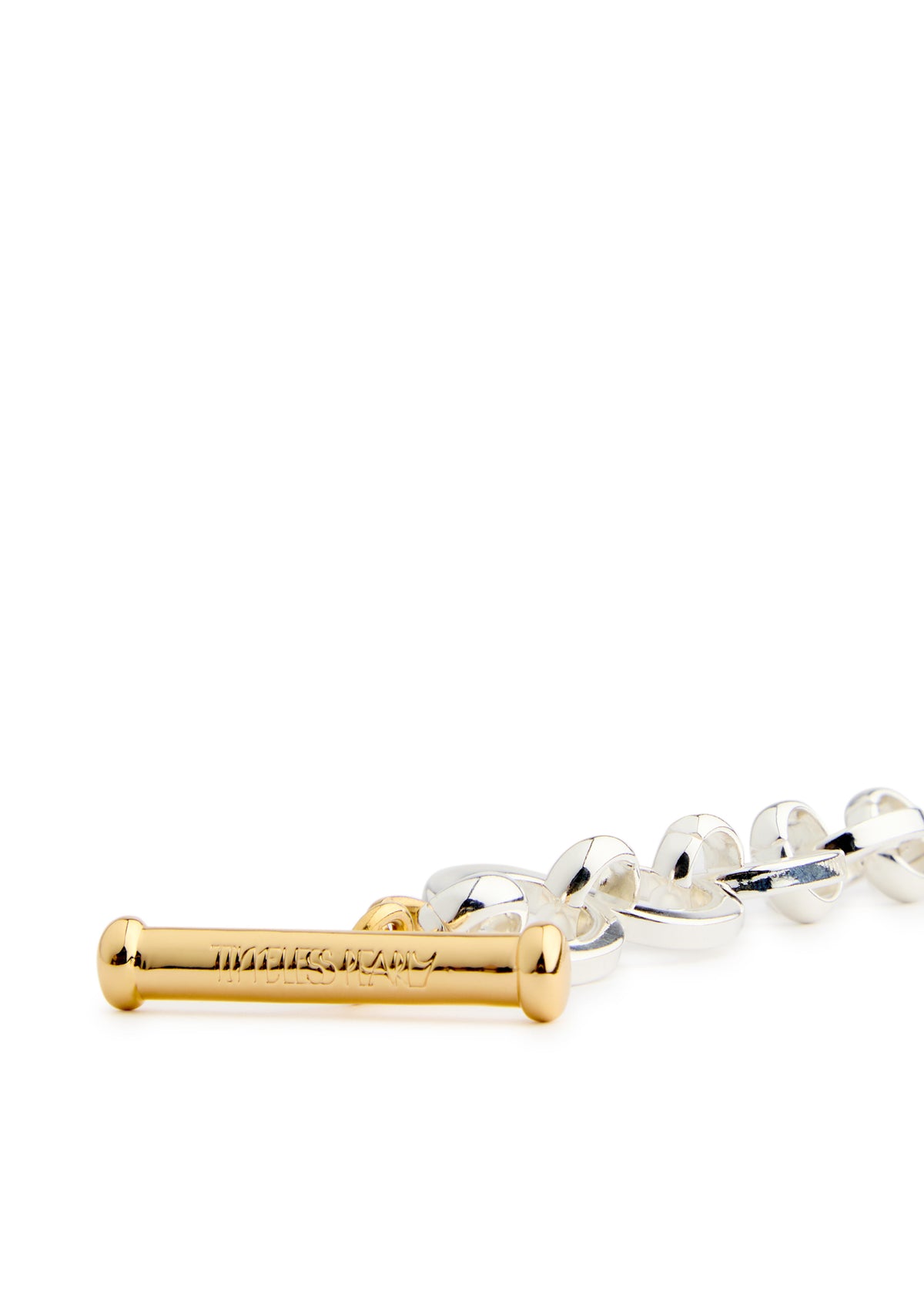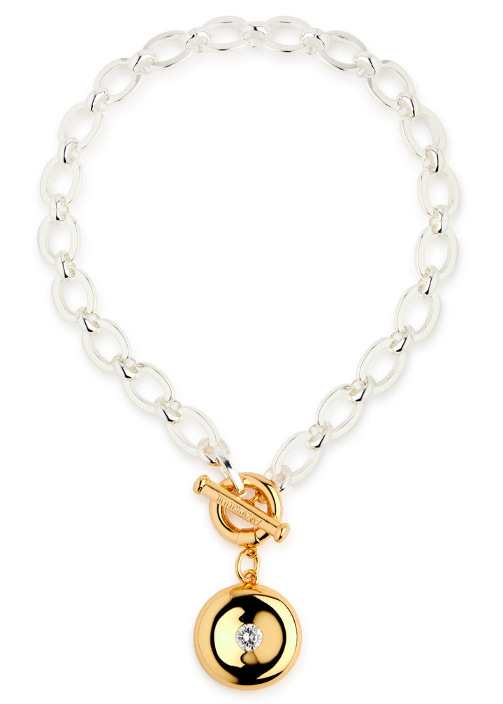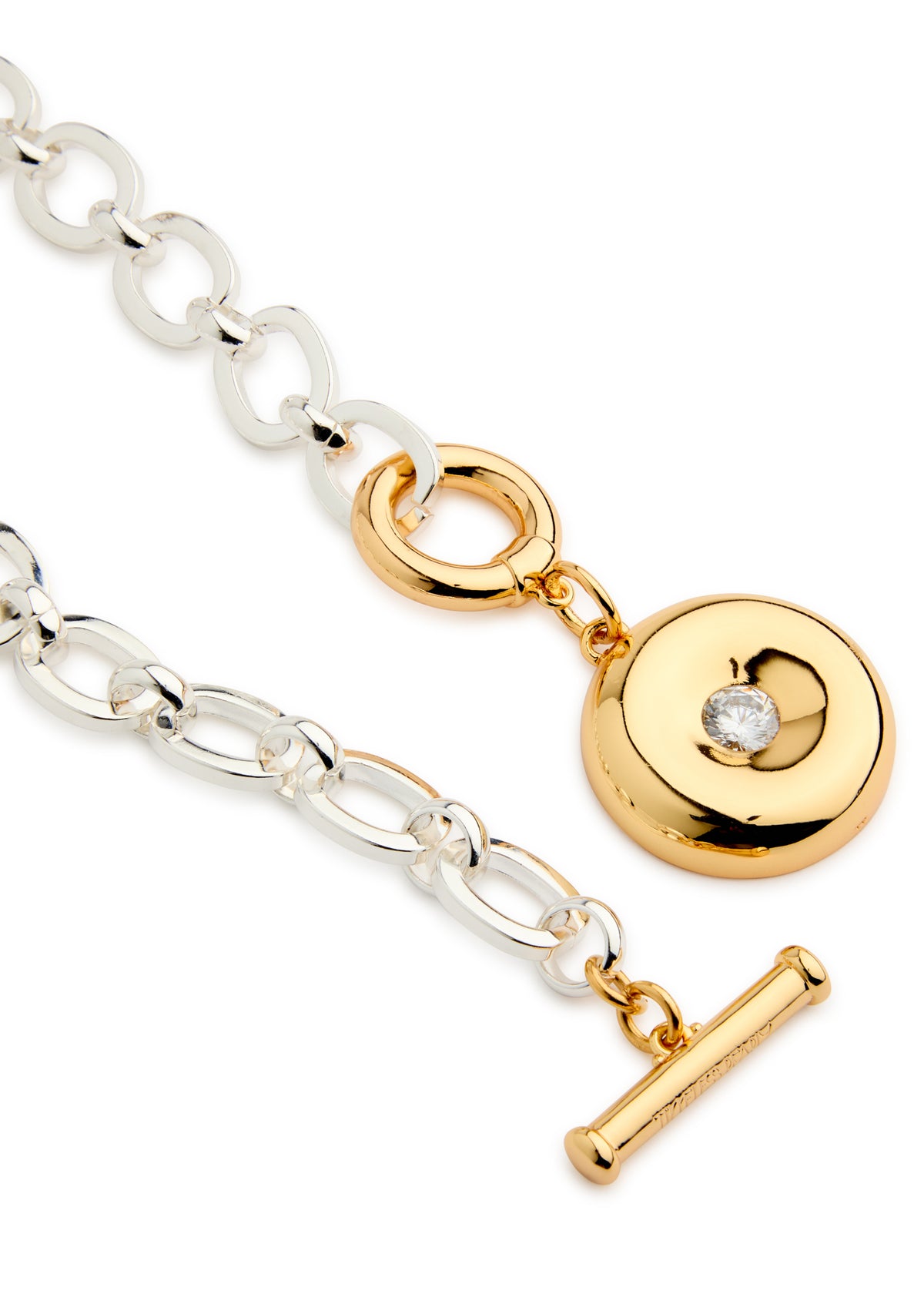 Handmade with a silver-plated chain and 24kt gold-plated donut pendant with crystal embellishment. Length: 40cm. Charm: 3cm x 3cm. T-bar fastening. Presented in a designer-stamped pouch.