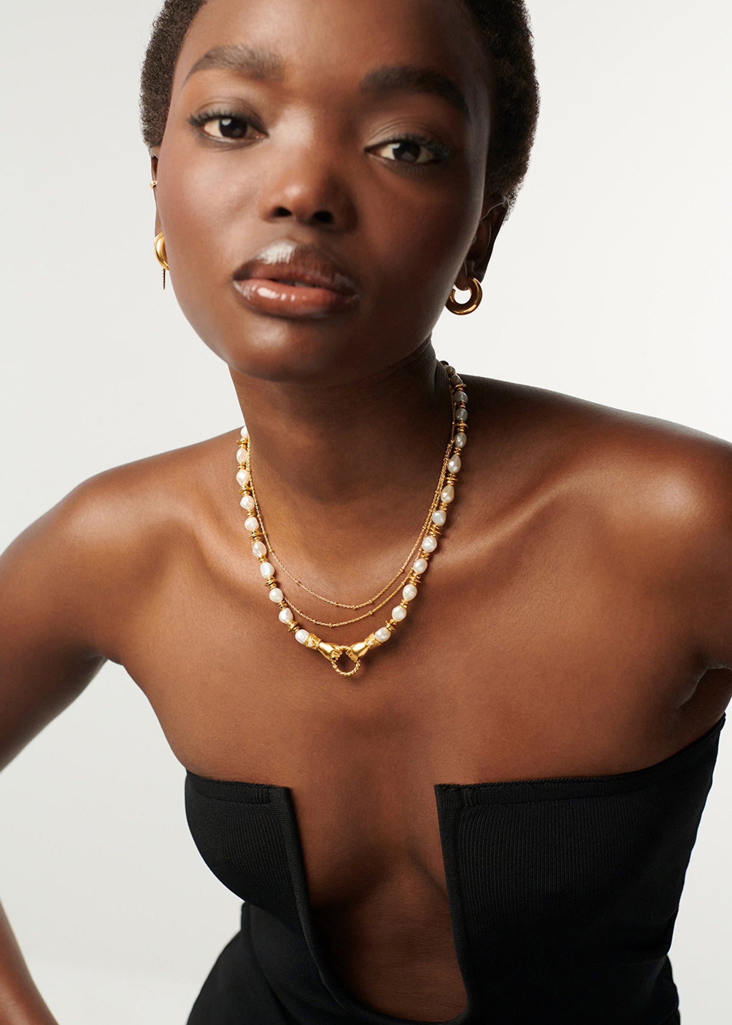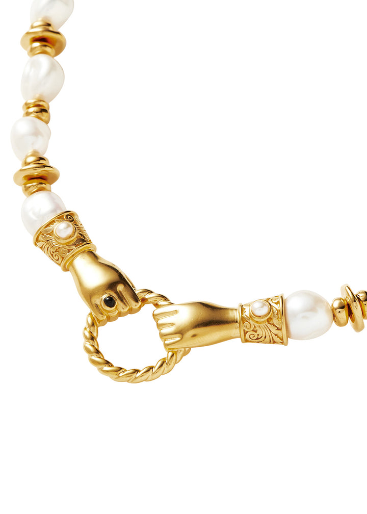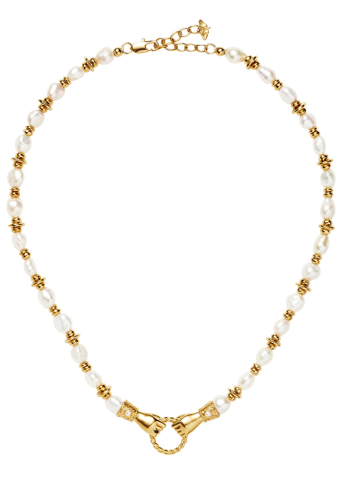This In Good Hands Beaded Necklace by Missoma X Harris Reed brings together classic elegance and symbolic charm with its 18kt gold-plated finish, white pearl beads, and unique hands and twisted hoop pendant adorned with onyx and white pearl cabochons. Reflecting Missoma's approach to chic, everyday luxury, this adjustable necklace is ideal for layering or wearing solo for a striking, meaningful touch to any outfit.