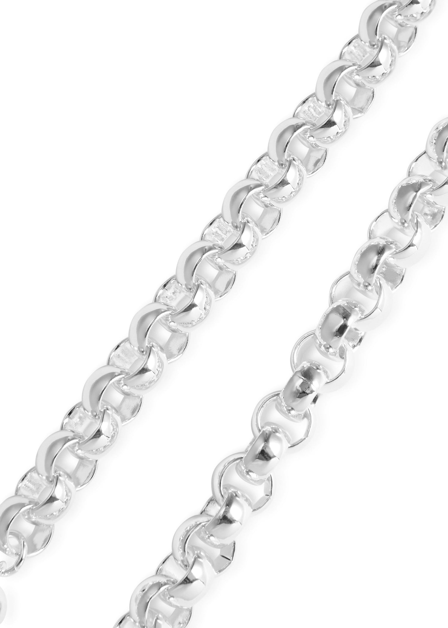 Available in silver-plated or gold-tone brass, featuring a designer tag and a secure lobster-clasp fastening. Length: 43 cm.