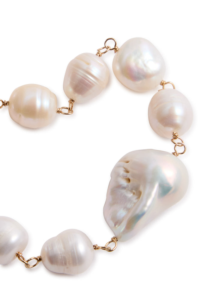 Crafted with baroque pearl embellishments and features an adjustable T-bar fastening for a customizable fit. Length adjustable from 45 cm to 53 cm. Presented in a designer-stamped pouch.