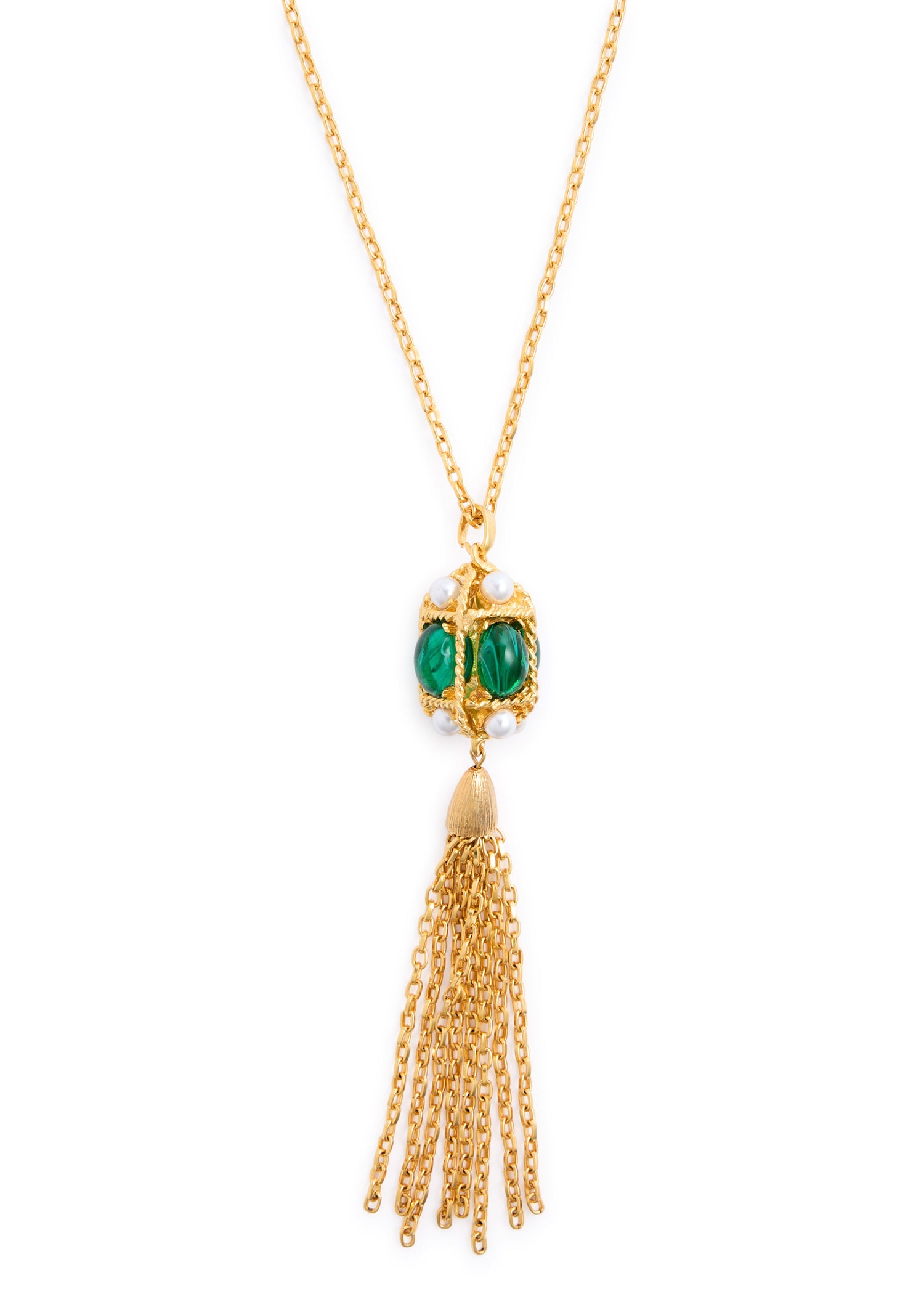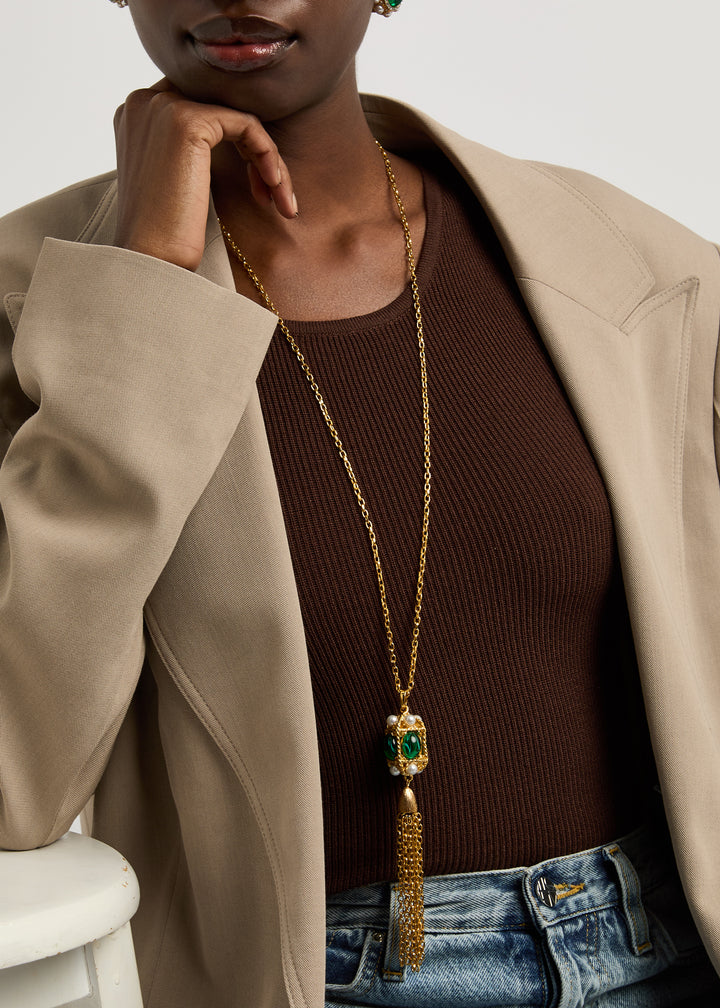 Crafted with a chain design featuring a sculpted twisted pendant, pearl and emerald gem embellishments, and a fringed chain detail. Includes designer tags and a secure lobster-clasp fastening. Length: 81 cm; pendant dimensions: 2.5 cm x 13.5 cm. Presented in a designer-stamped pouch.