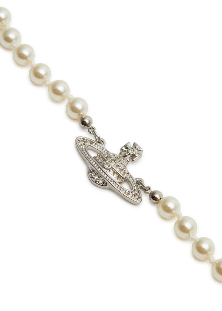 This Mini Bas Relief Faux Pearl Necklace by Vivienne Westwood blends timeless sophistication with a touch of rebellion, featuring a Swarovski faux pearl strand and a crystal-embellished orb plaque. This piece embodies Vivienne Westwood's iconic style, making it a chic addition for those who love avant-garde elegance.