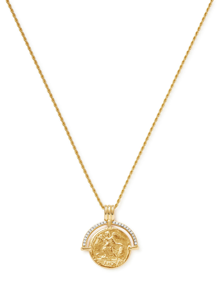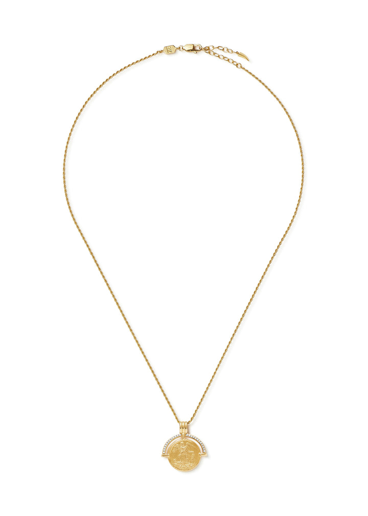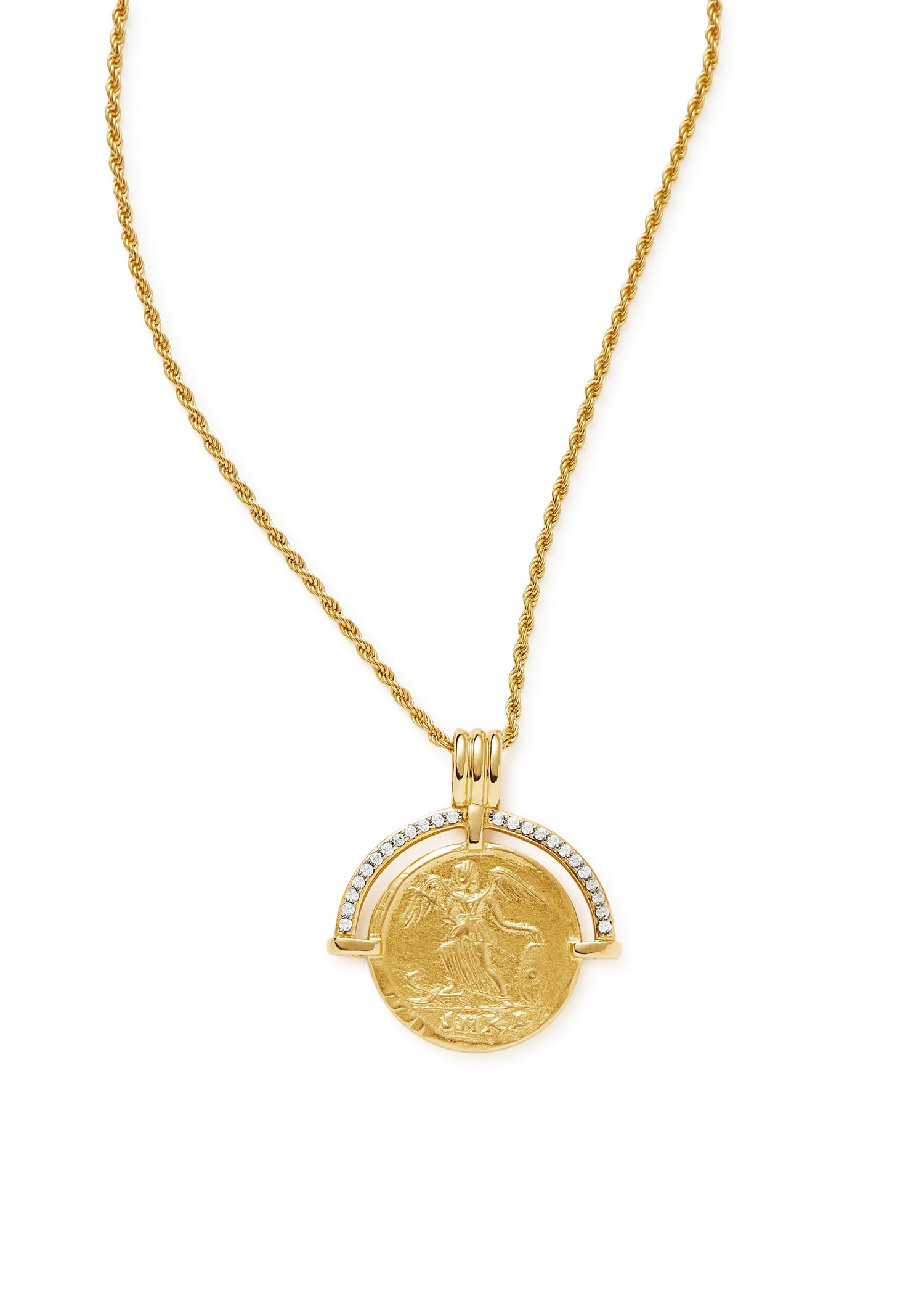 18kt recycled gold vermeil on recycled sterling silver with engraved coin pendant and pavé crystal embellishments. Length: 50 cm, Coin dimensions: 1.9 cm x 1.7 cm. Adjustable lobster-clasp fastening.