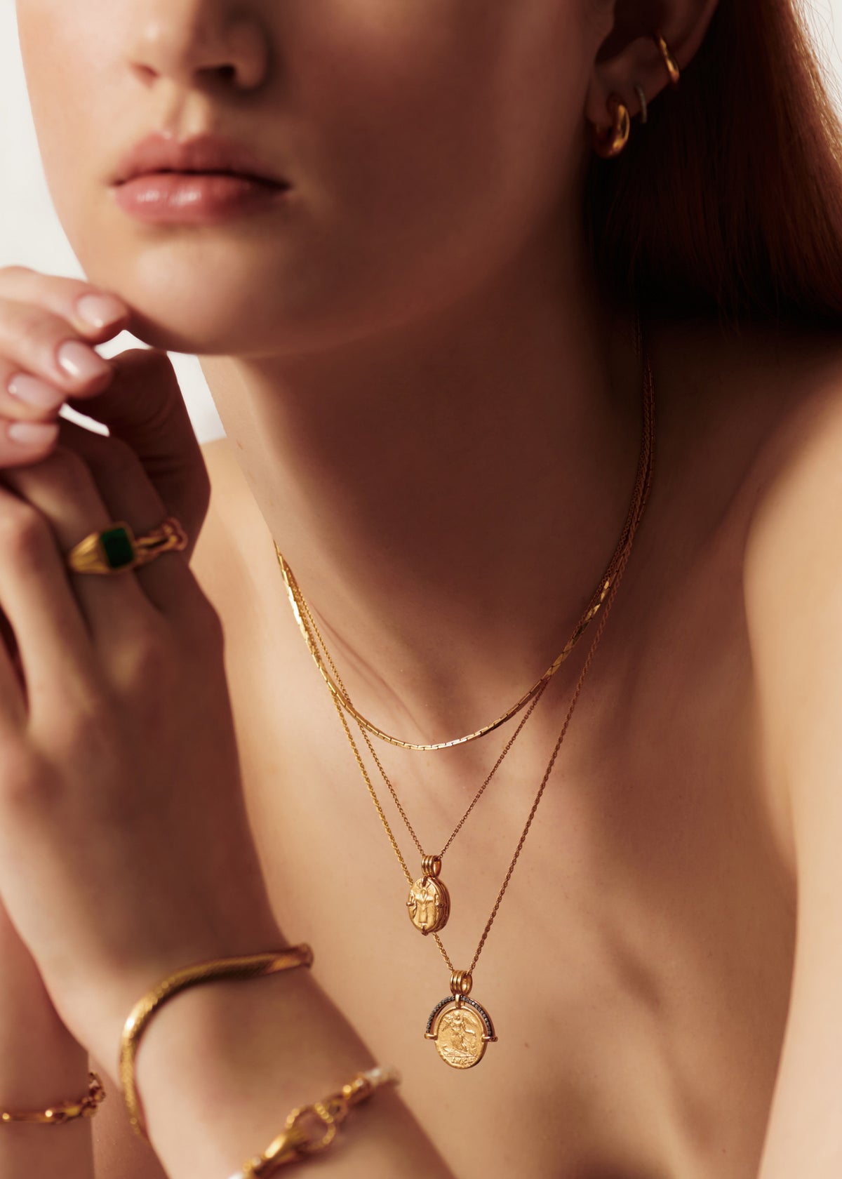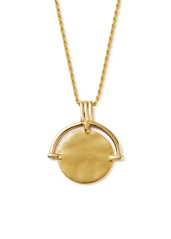 This Fortuna Arc 18kt Gold Vermeil Necklace by Missoma X Lucy Williams exudes a modern luxury with a vintage-inspired engraved coin pendant, complete with pavé crystal embellishments. Made from recycled gold vermeil on sterling silver, this piece reflects Missoma’s commitment to sustainability and chic style, ideal for layering or wearing solo.