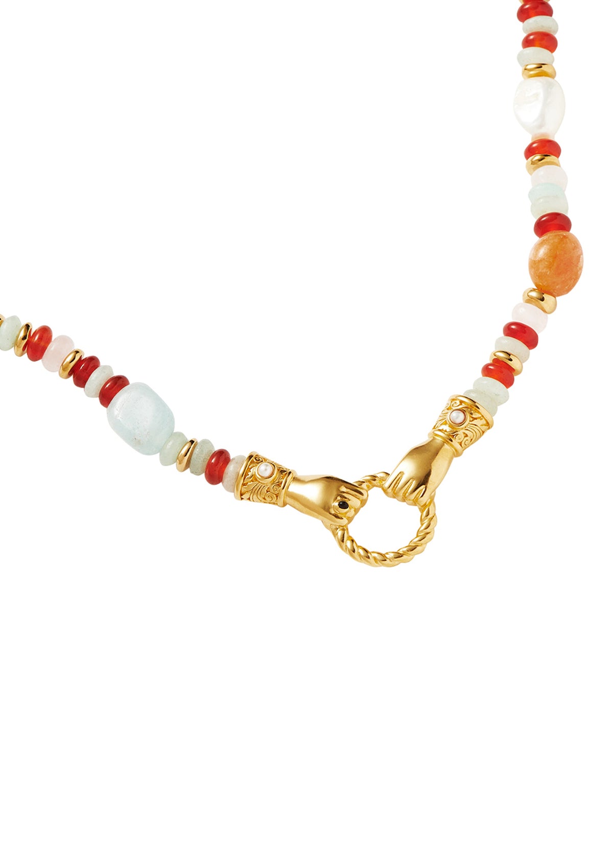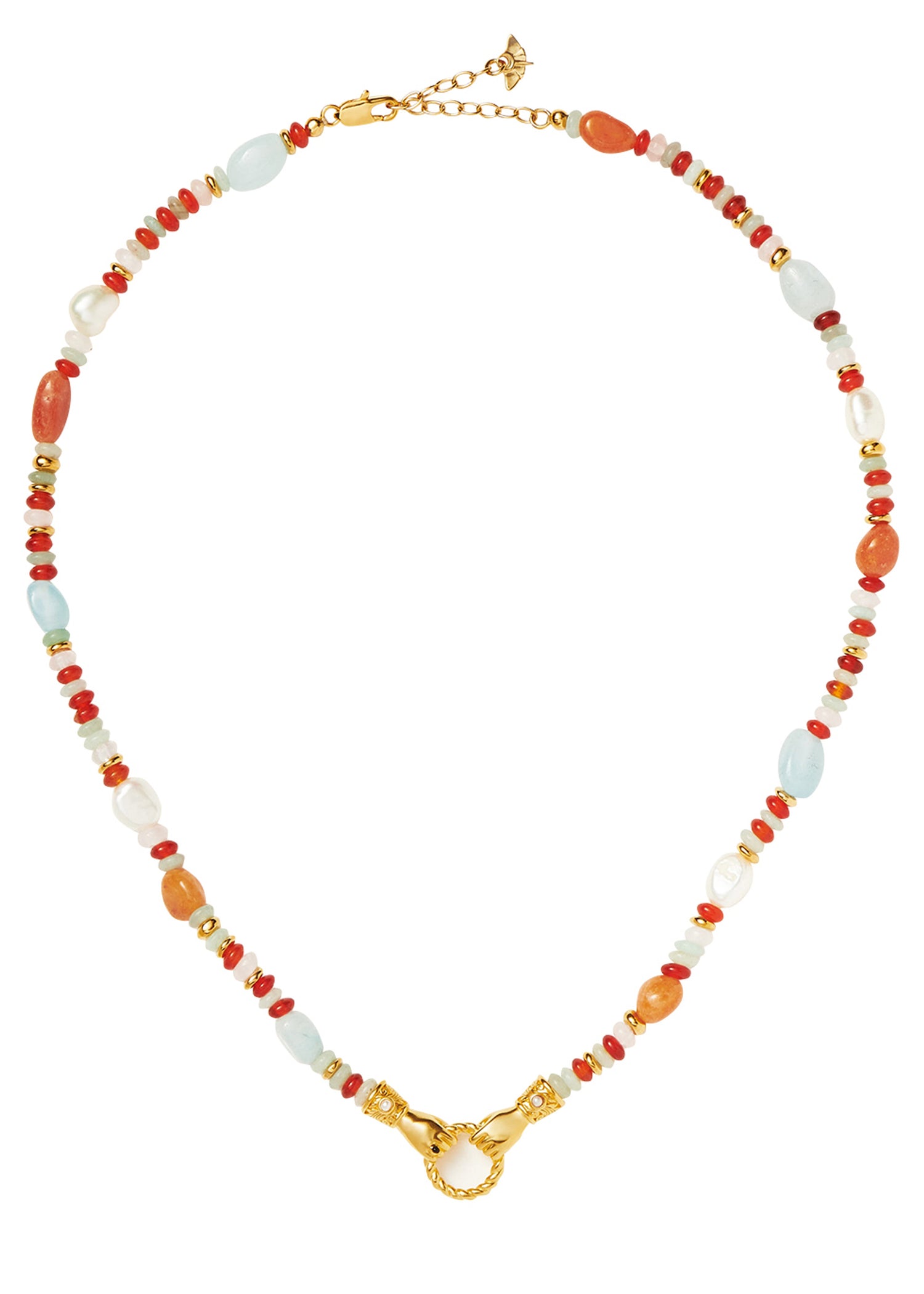 18kt gold-plated with dyed green quartz, green calcite, green aventurine, and pearl beads, hands, and twisted hoop pendant with onyx and white pearl cabochon. Length: 45 cm. Adjustable lobster-clasp fastening.