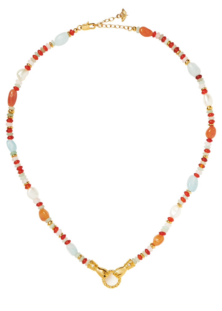 This In Good Hands Beaded Necklace by Missoma X Harris Reed brings an eclectic blend of style and symbolism with its assortment of green quartz, green calcite, green aventurine, and pearl beads. Featuring a hands and twisted hoop pendant with onyx and white pearl cabochon details, this piece is perfect for adding a vibrant, statement touch to any ensemble.