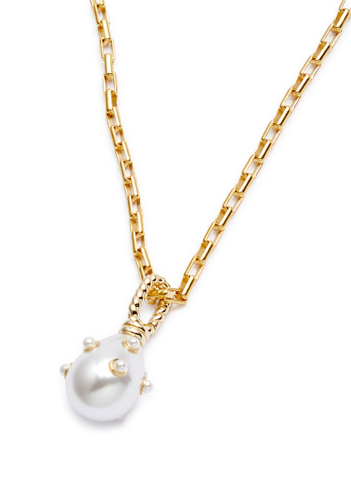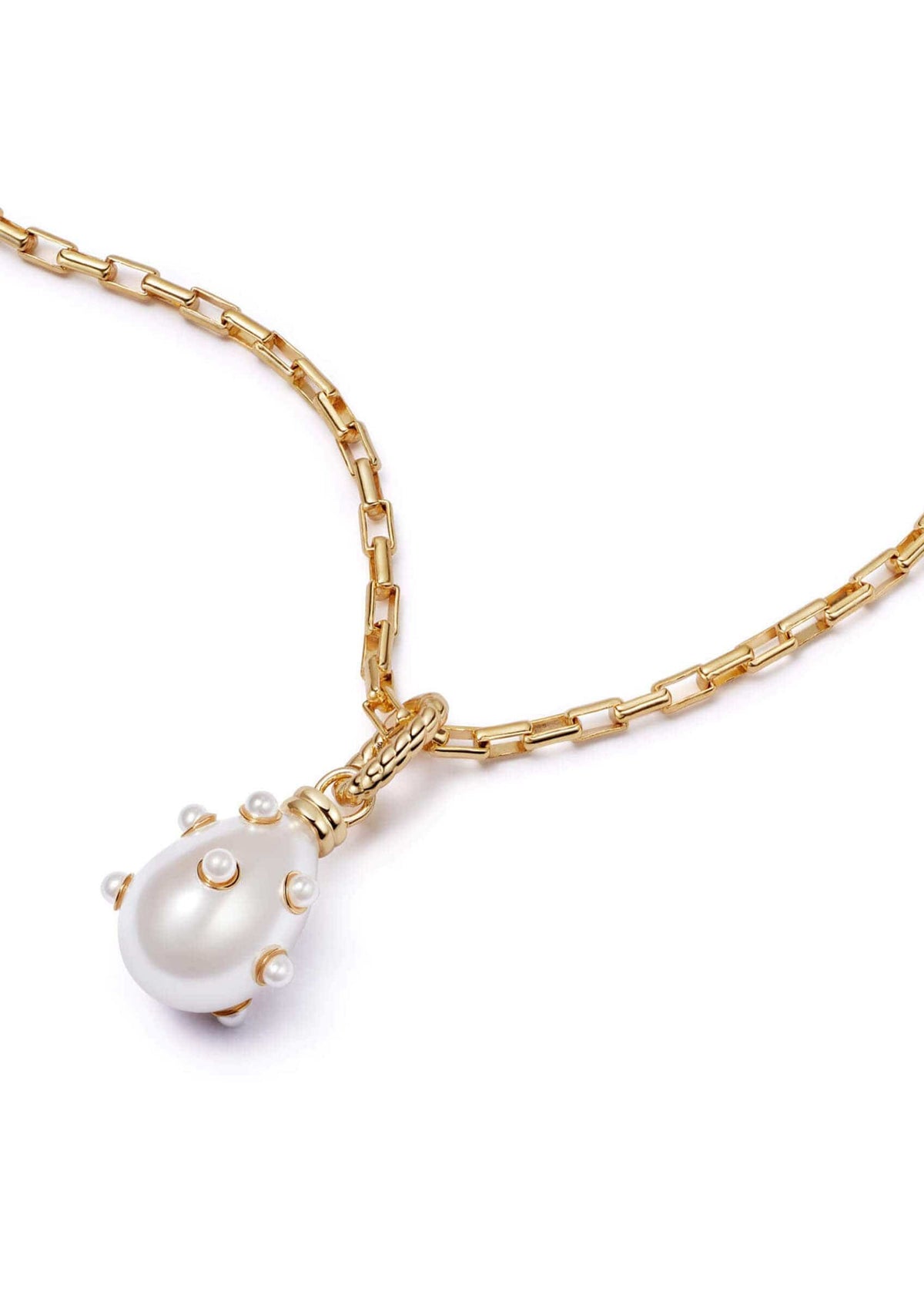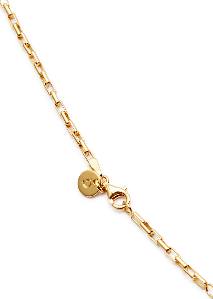 18kt gold-plated recycled silver with box-link chain and pearl pendant. Adjustable drop: 21.5 cm–27 cm, Pendant dimensions: 2.5 cm x 1 cm. Lobster-clasp fastening.