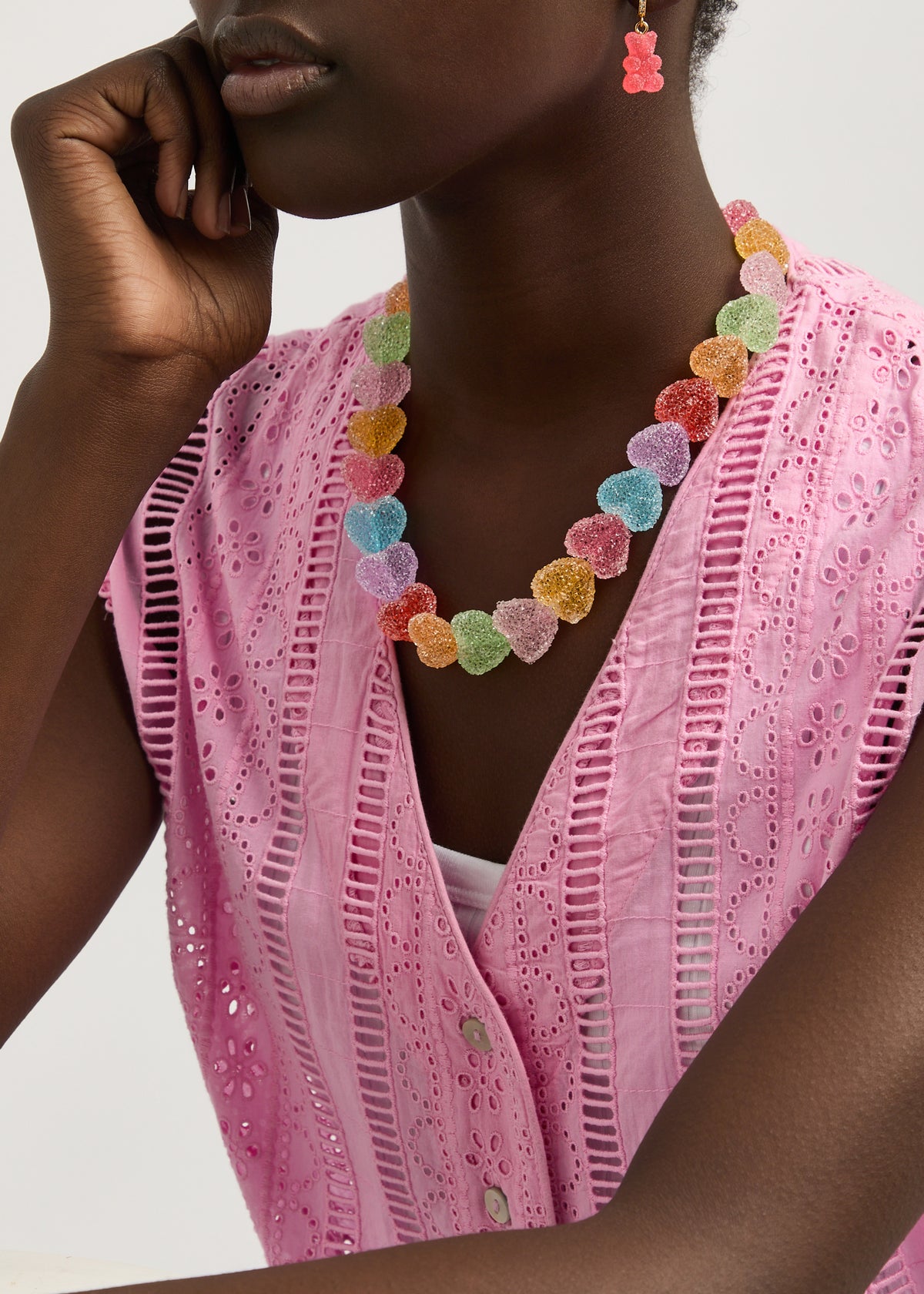 This Jelly Heart 18kt Gold-Plated Necklace by Crystal Haze adds a touch of playful charm with its textured resin heart pendant, embodying the brand’s vibrant, trend-driven style. Ideal for self-expression, this piece is designed for those who appreciate bold and unique accessories that bring personality to their look.