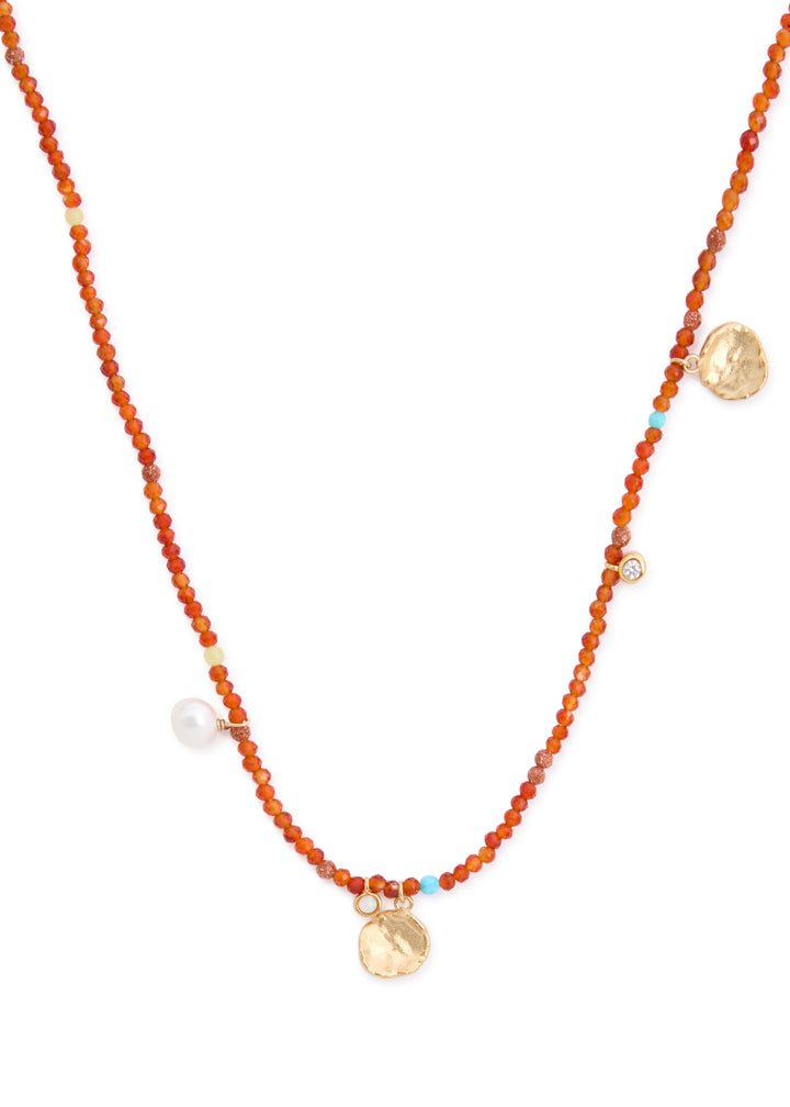 Glass and stone beads with 18kt gold-plated hardware, molten charms, crystal embellishment, and freshwater pearl. Length: 43 cm. Adjustable lobster-clasp fastening.